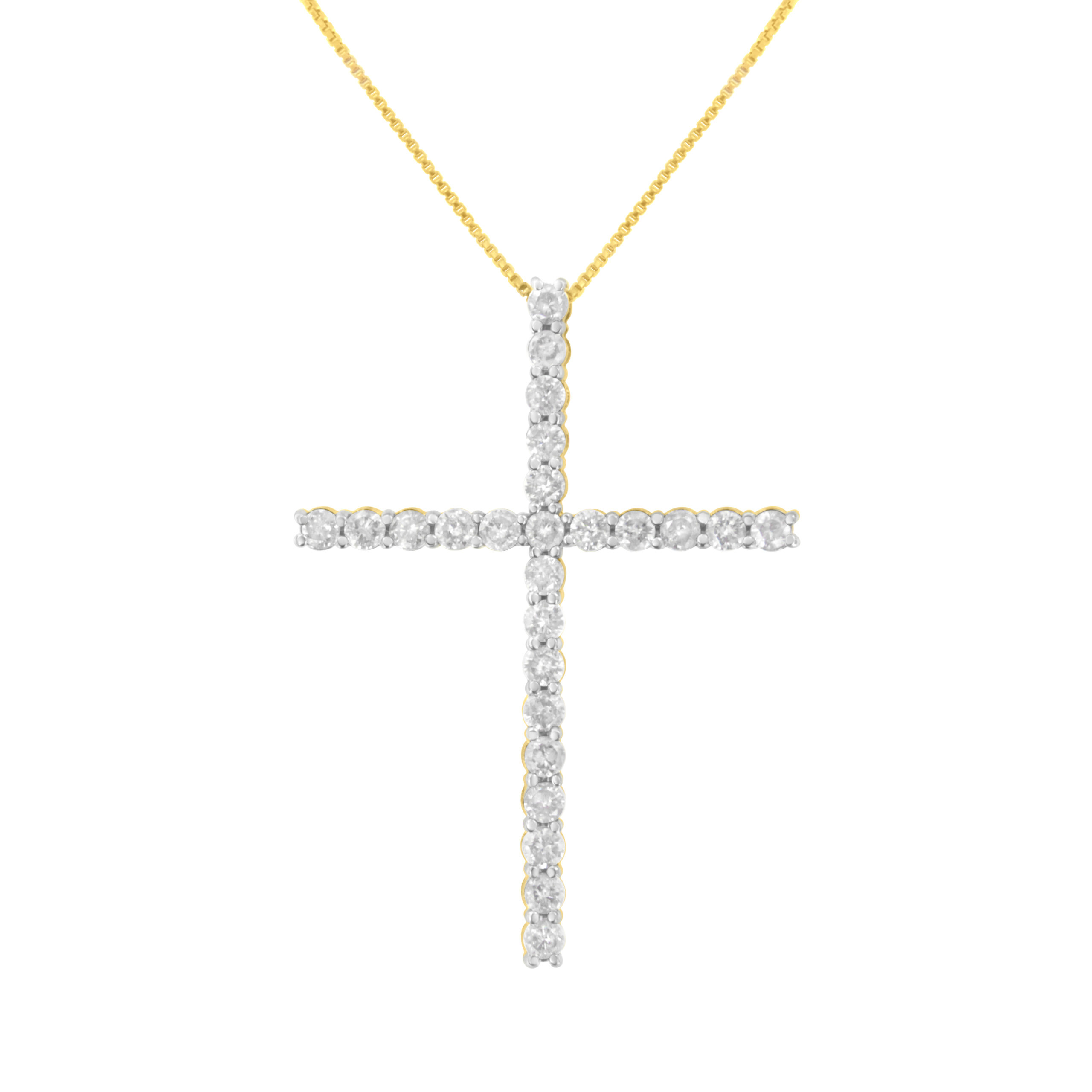 Share your faith with this stunning diamond cross pendant necklace. This cherished cross necklace for her, features 25 natural,round diamonds set in 2 Micron 10k Yellow Gold Plated Sterling Silver. The pendant is suspended from an 18-inch box chain with spring ring. This fine jewelry cross necklace has a total diamond weight of 2.50 carats and is a contemporary classic. Color grade range is H-I and the clarity grade ranges from I2-I3.
