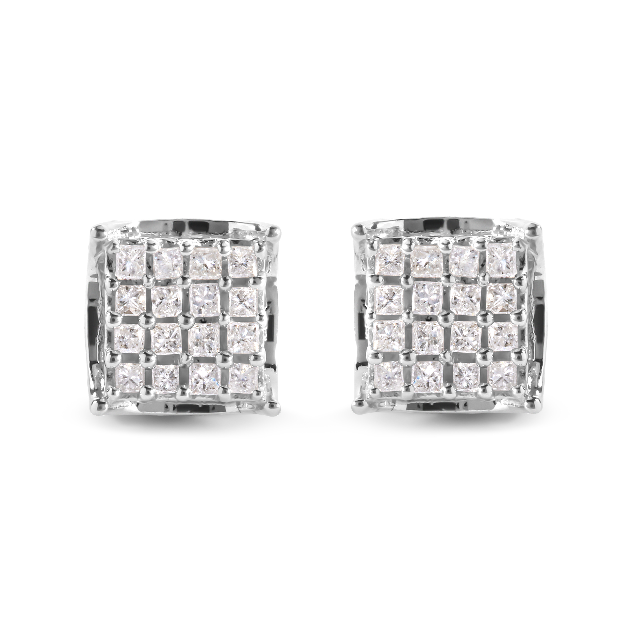 Indulge in the ultimate luxury with these stunning 10K White Gold Princess Diamond Classic Composite Stud Earrings. Perfect for any occasion, these earrings boast a total weight of 1/2 cttw and 32 dazzling diamonds that are carefully set in a prong setting. The I-J color and I1-I2 clarity of these natural diamonds add to their brilliance, making them a true sight to behold. The diamond composite stud design is both classic and modern, ensuring that these earrings will never go out of style. With push back earring findings, these earrings are easy and comfortable to wear. Perfect for any woman who wants to add a touch of glamour to her look, these earrings are a must-have addition to any jewelry collection.