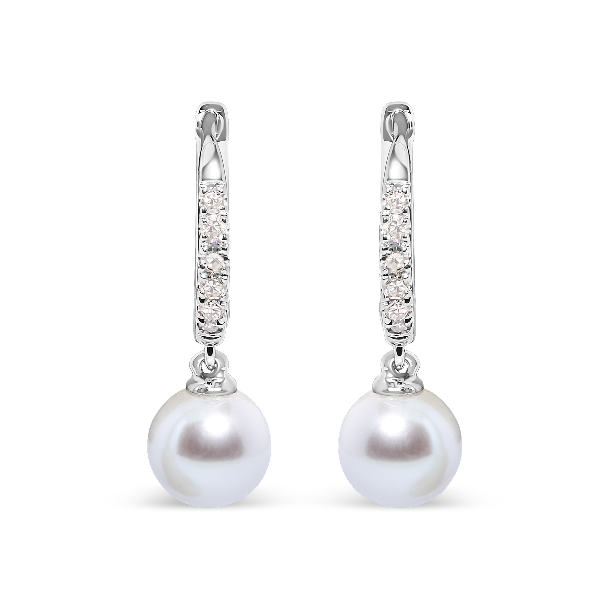 10K White Gold 6×6 MM Cultured Freshwater Pearl and Diamond Accent Drop Huggy Earring (H-I Color, I1-I2 Clarity)