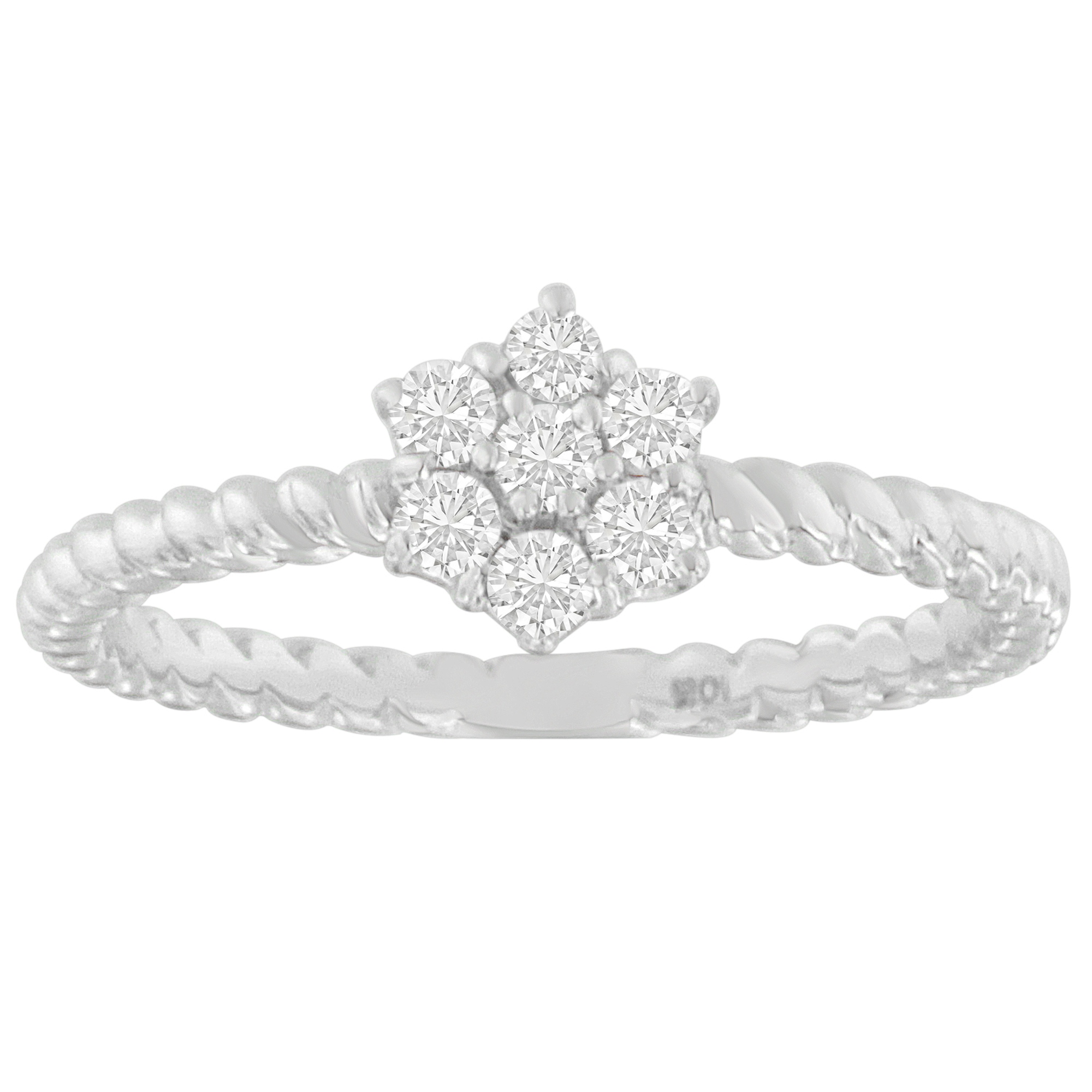 A gorgeous gold and diamond cluster ring. This ring is made with 7 round-cut diamonds in a prong setting, weighing a total of 1/4 ct. The diamonds are set in a lustrous 10k white gold band, resembling a twisted rope design.