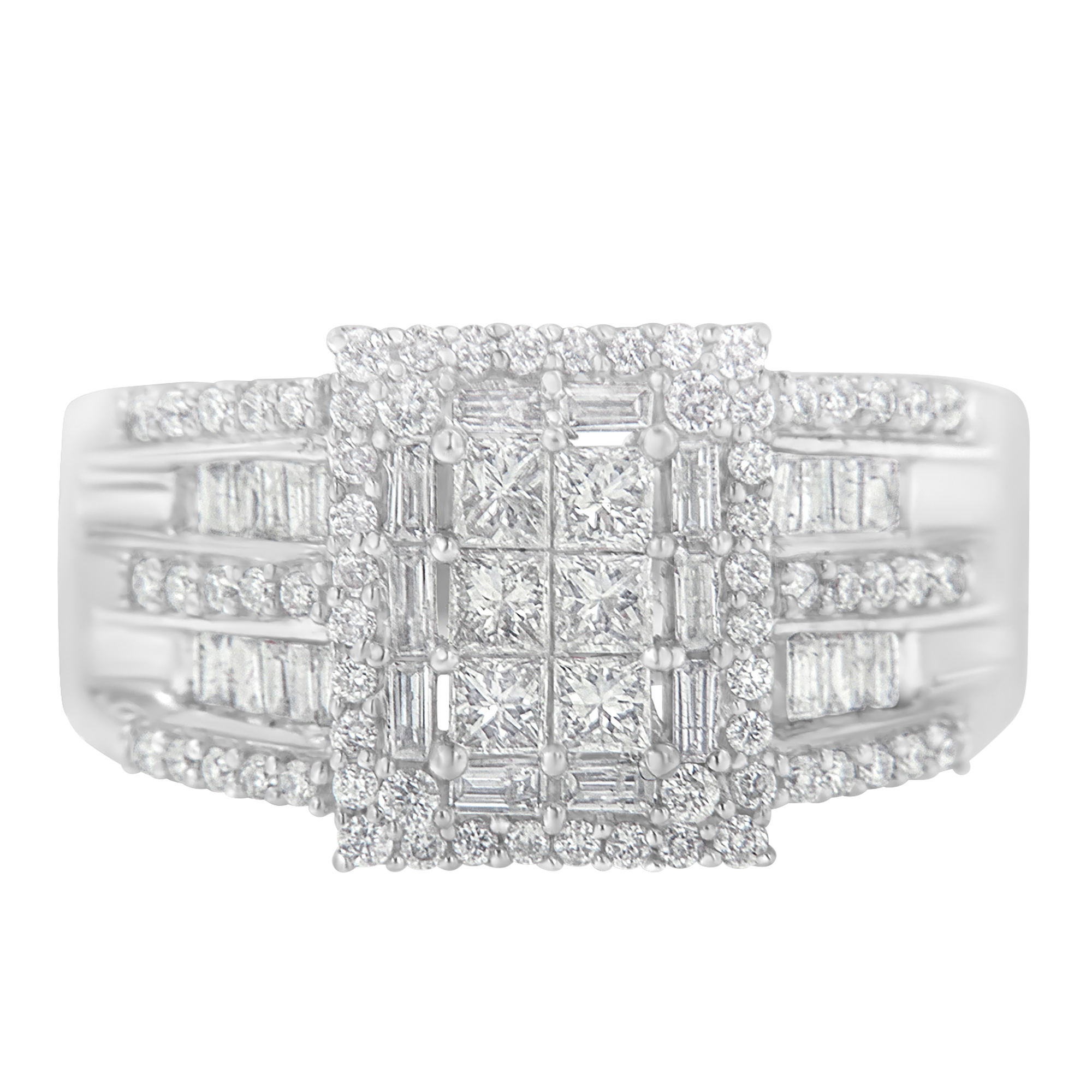 A diamond and gold cluster ring. The ring features 6 princess, 32 baguette, and 66 round diamonds together weighing 1 carat. They are set in a 10k white gold band.