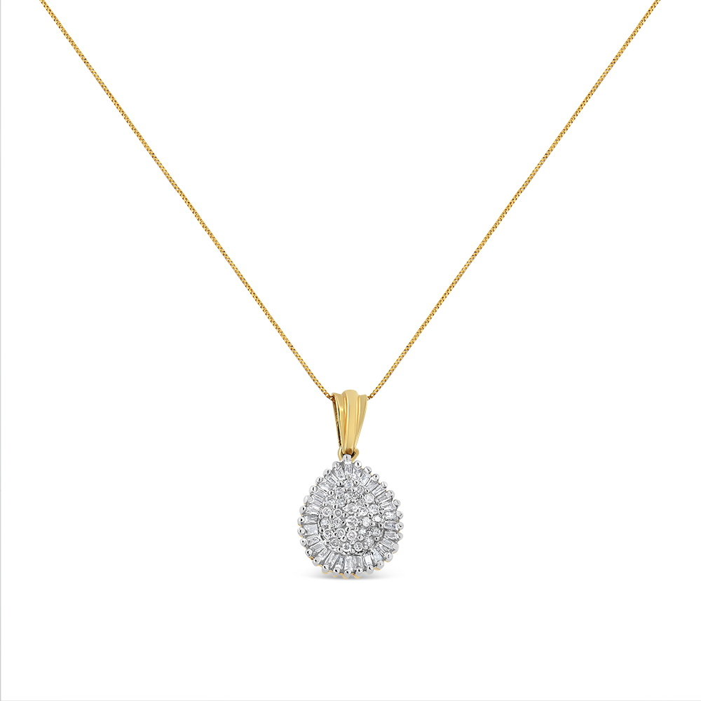 Lovely and eye-catching, this 10k yellow gold pendant stands out with for its cluster of natural diamonds. A line of baguette-cut diamonds surround a central cluster of round-cut diamonds in a prong setting. This 1/2 cttw necklace is a show dropper and will garner the attention of all who see it. This pendant comes with an 18″ gold box chain, and will look beautiful resting on your neck.