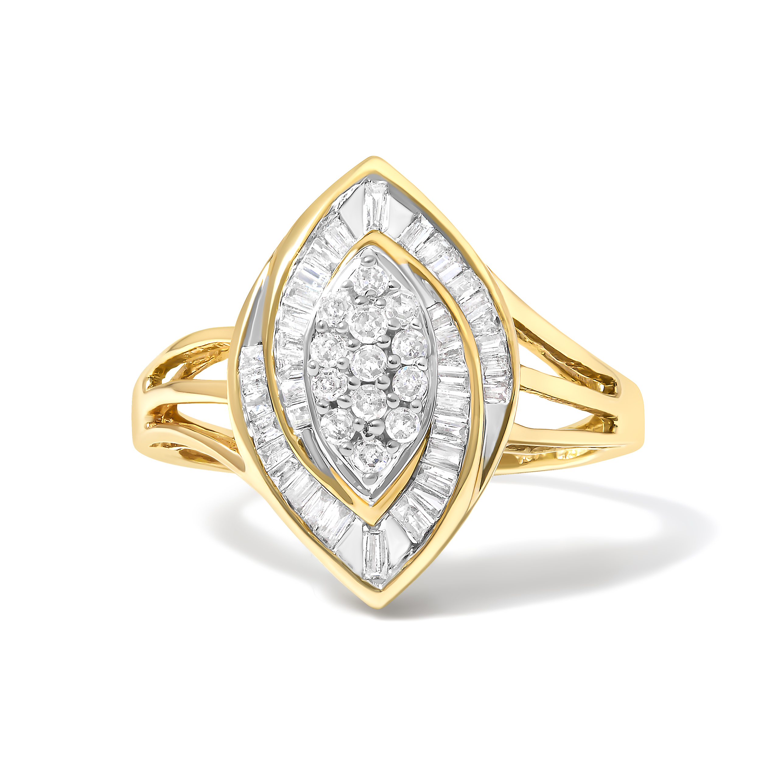 A modern gold and diamond oval ring. This cluster ring is made with 13 round and 35 baguette cut diamonds, weighing a total of 1/2 ct. The diamonds are set in lustrous 10k yellow gold.