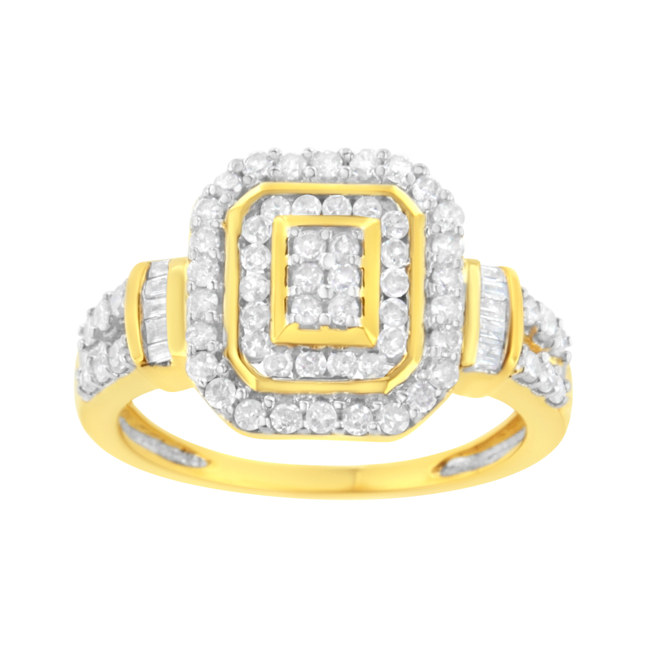 Dazzle at your next formal gathering with this stunning 10k yellow gold plated .925 sterling silver cluster ring. An intricate design of round-cut diamonds and yellow gold make up the central rectangular motif of this piece, while baguette and round-cut diamonds embellish the gold band. You will love how this ring sparkles on your finger. This piece is also a great gift for a loved one on any special occasion.