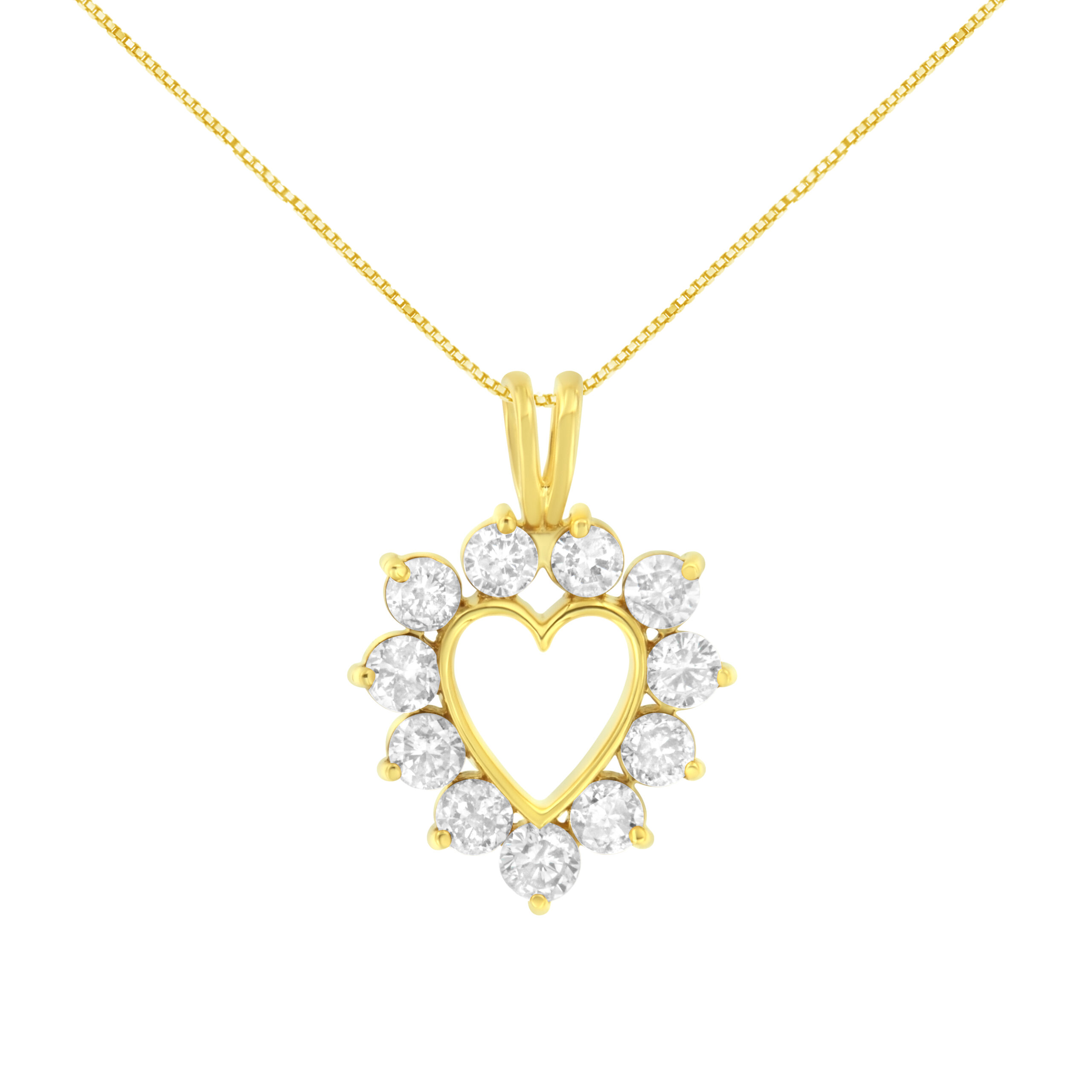 Spread love and positivity at all times with this stunning necklace that’s cinched with an open heart pendant, surrounded by 11 round natural diamonds in a one-prong setting, totalling up to 1.0 cttw. The box necklace is a 10k yellow gold plated .925 Sterling Silver chain that’s secured with a spring-ring. Measuring at 18-inch, the piece sits beautifully on the decollétage. Pair this with matching heart-shaped earrings to sweeten up the simplest of looks.