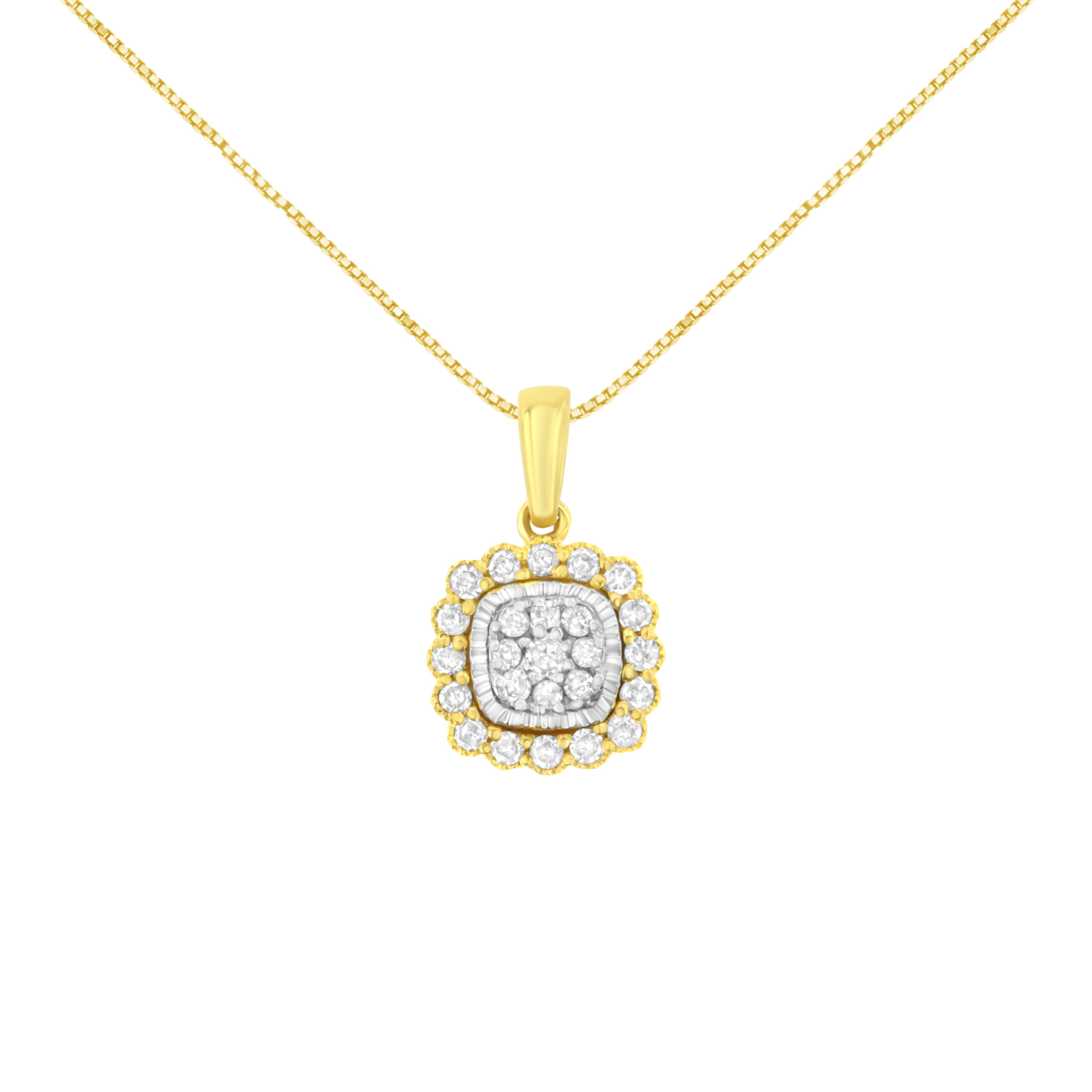 Minimalism is the latest fashion! Sparkle in the glory of stunning natural diamonds embedded in this .925 sterling silver necklace flash plated with 10K yellow gold. This 18″ box chain with 25 round, prong set, natural diamonds in a square cushion shape is the perfect mix of luxury and class. It fastens securely with a spring ring clasp making it wearable for all your occasions. The I1-I2 Clear 0.25 ct diamonds makes you shine like a star. This is the type of pendant necklace you should gift your daughter on her birthday, sister on her graduation day, mother on Mother’s Day and wife on your anniversary. But don’t wait until then; buy it now because every day is a good occasion to gift this unique piece.