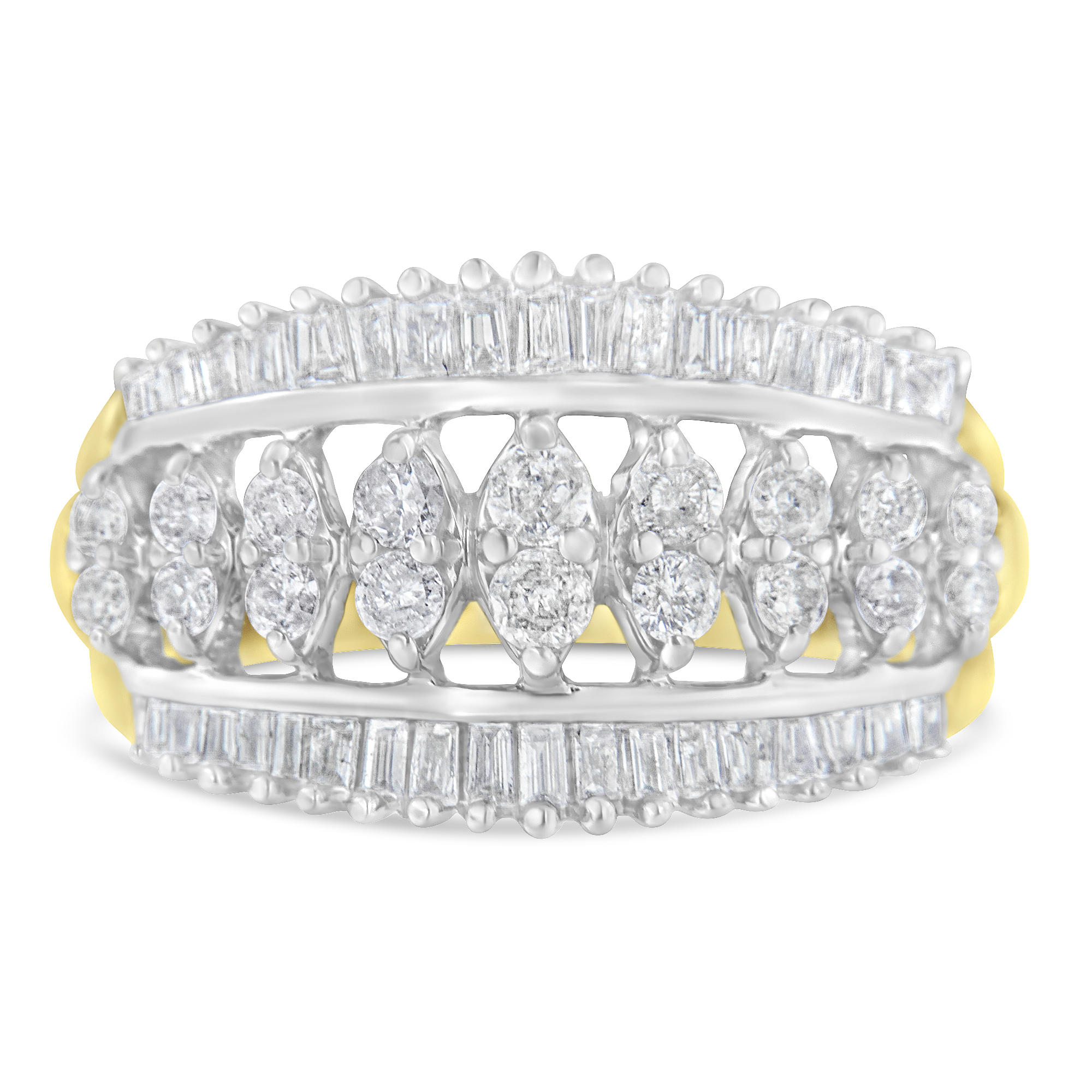 Become a show stopper at any event by wearing this dazzling 10 karat Two-Toned gold crown-shaped diamond ring. Designed with ultimate elegance, the outer shanks of the ring are enriched with baguette cut diamonds in a bezel setting. Further, the middle row of the ring is encrusted with shimmering round cut diamonds that add a more luxurious appeal to this masterpiece.