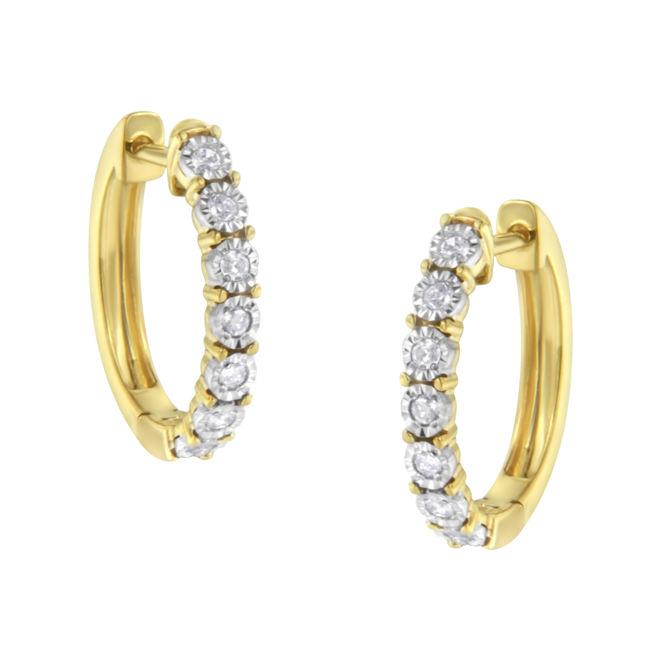Fashioned in stunning 10k two-toned gold, these beautiful hoop earrings feature 1/4ct of brilliant round cut diamonds in a miracle setting that delicately flow half way around the outside of the hoop. A classic piece you can wear everyday.
