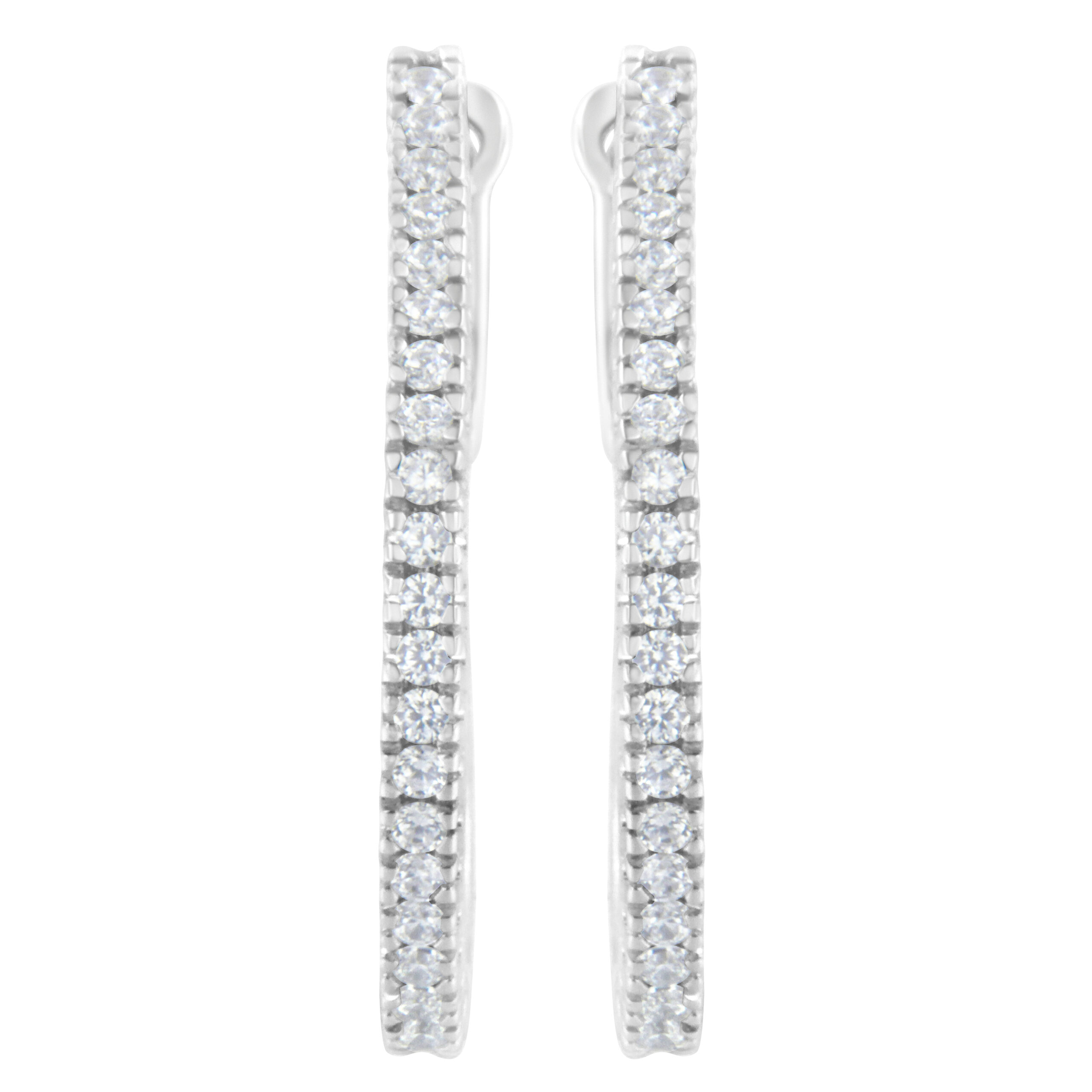 These glamorous 10k white gold hoop earrings showcase a 1/2ct of round cut diamonds. The prong set diamonds inlay half the outside of the hoops giving them maximum sparkle. These gorgeous hoop earrings are the perfect gift for that trendy, special someone in your life.