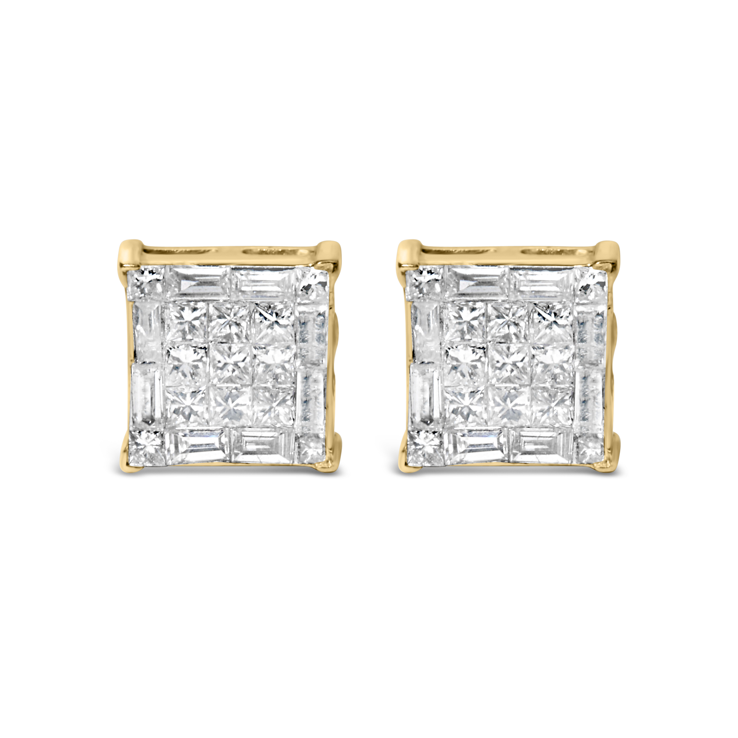 This glamorous pair of stud earrings features cluster of nine princess cut diamonds set in a square shape within a halo of round a baguette diamonds. Crafted in 10 karat yellow gold, they have a total diamond weight of 1/2 carat.