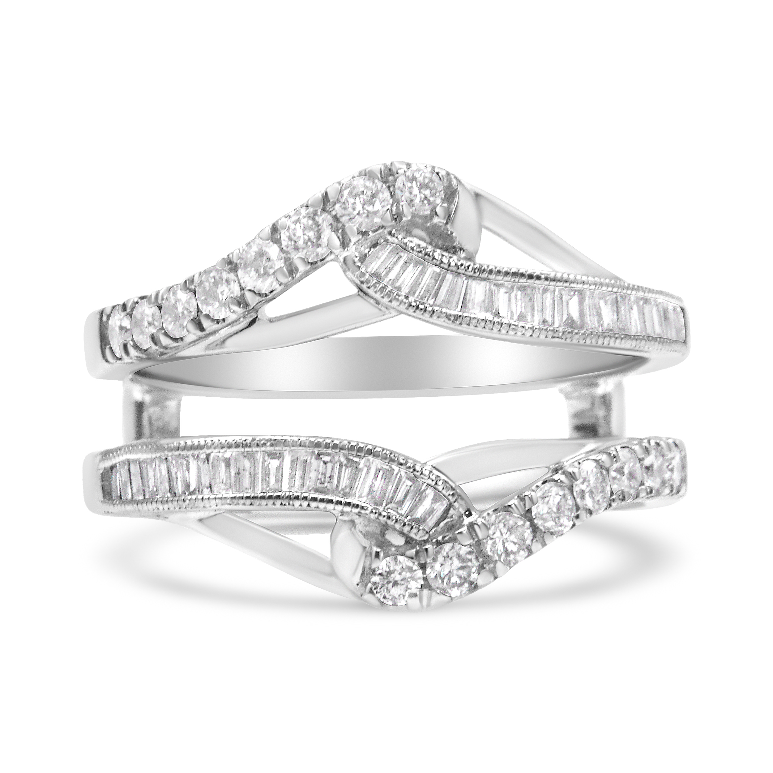 This sparkling ring enhancer is a piece that will instantly elevate her bridal or diamond solitaire ring. The look displays a top and bottom row of round diamonds in prong settings, offset by complementing rows of baguette diamonds in an invisible setting that perfectly showcases the sparkling stones and the precious 14k white gold metal of the ring. These diamonds total 0.65 cttw with an approximate I-J Color and I2-I3 Clarity. Along the rows of baguette diamonds, intricate milgrain detail further elevates this elegant look. The gap between guards is 4.5mm.