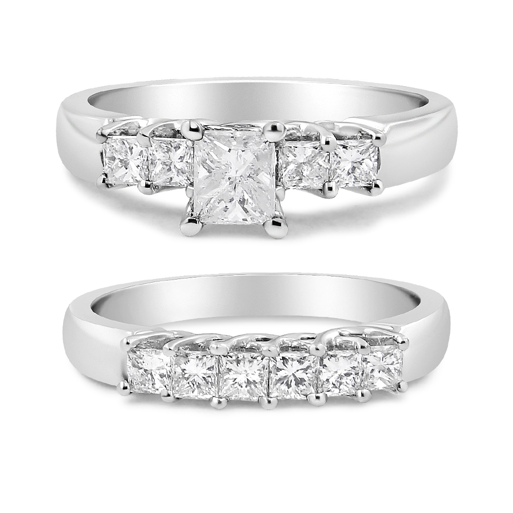This 14k white gold diamond bridal set features a striking engagement ring and a matching wedding band. This classic five stone diamond engagement ring and matching wedding band feature a ½ ct center stone and 10 princess cut side diamonds. Each side stone is .10 ct tdw, and in sum, this wedding band set has a stunning 1 ½ ct tdw. Each princess cut is elegantly set in the sharing prong setting to minimize metal look and maximize diamond sparkle.