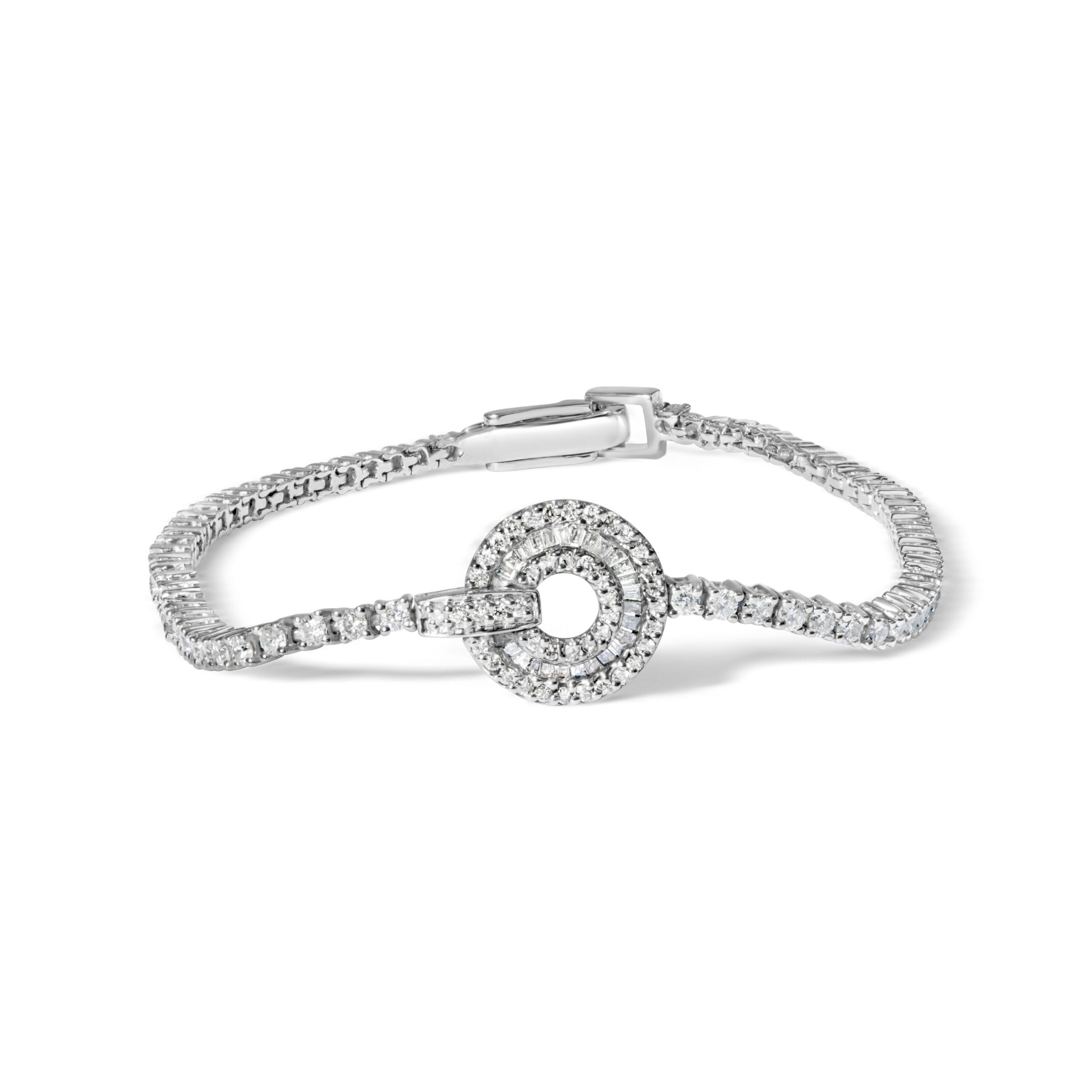 Indulge in the timeless elegance of this classic diamond tennis bracelet, crafted from lustrous 14K white gold. With a total of 133 natural diamonds, including 109 round and 24 baguette-cut diamonds, this bracelet dazzles with a stunning 2 1/2 cttw. Each diamond boasts an impressive H-I color and I1-I2 clarity and is perfectly set in prongs and channels to ensure maximum light reflection. The medallion centerpiece adds a unique touch to this already exquisite piece, making it a true statement of sophistication and luxury. The secure box clasp ensures a comfortable and worry-free fit, so you can wear it with confidence. This stunning bracelet makes the perfect gift for someone special or a delightful addition to your own collection. Its classic design and quality craftsmanship ensure it will be a cherished piece for years to come.