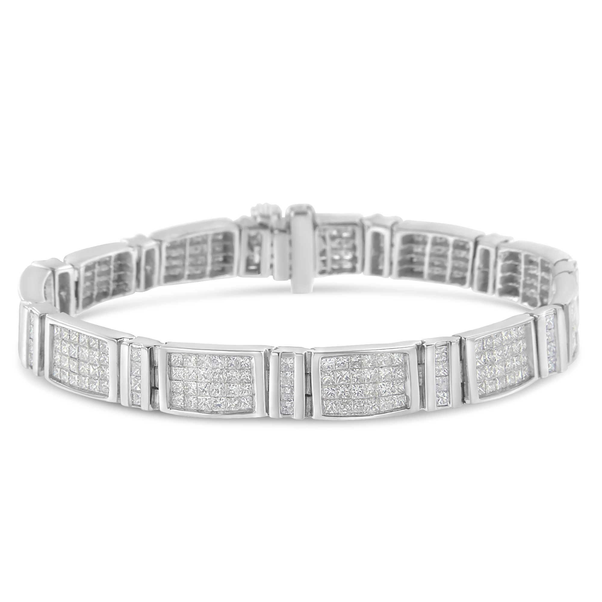 A must have for any serious jewelry collection, this stunning 14K white gold tennis bracelet boasts an impressive 7.0 carat total weight of diamonds with a whopping 308 individual stones. The bracelet features alternating vertical and horizontal rectangular links. The horizontal links feature grids of invisible set princess cut diamonds, while the vertical links feature single rows of channel set princess cut diamonds. Each diamond studded link is connected by hinges. Elegant and timeless, this gorgeous 7” tennis bracelet fastens securely with a box with tongue and safety clasp. This classic, bold bracelet makes a great gift for any special occasion! Whether worn for daytime glamour or evening sparkle, this bracelet is gorgeously versatile. Give her a gift that will perfectly complement her favorite ensemble.