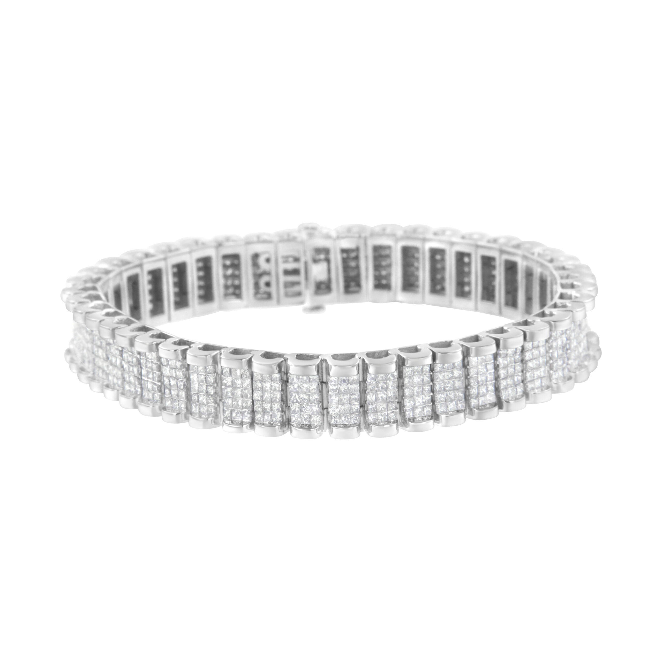 A must have for any serious jewelry collection, this stunning 14K white gold tennis bracelet boasts an impressive 7.0 carat total weight of diamonds with a whopping 660 individual stones. The bracelet features links with 15 invisible set princess cut diamonds in a grid with round bumpers that protect the stones. Each diamond studded link is connected by hinges. Elegant and timeless, this gorgeous 7” tennis bracelet fastens securely with a box with tongue and safety clasp. This classic, bold bracelet makes a great gift for any special occasion! Whether worn for daytime glamour or evening sparkle, this bracelet is gorgeously versatile. Give her a gift that will perfectly complement her favorite ensemble.
