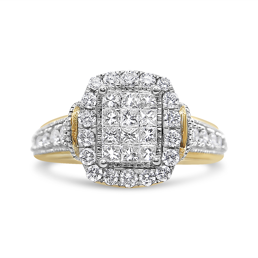 A remarkable design, this exquisite women’s diamond cluster ring is a showstopper, adorned with an array of 1.00 Cttw diamonds of approximate SI1-SI2 clarity and H-I color. The eye is drawn to the center of this ring, where a collection of princess-cut diamonds form a regal empire shape in an invisible setting to perfectly showcases the sparkle of the stones. Gorgeous round, prong-set diamonds halo this centerpiece, and are also featured along the shank for added brilliance. Truly mesmerizing, this ring is fashioned in 14k white and yellow gold.