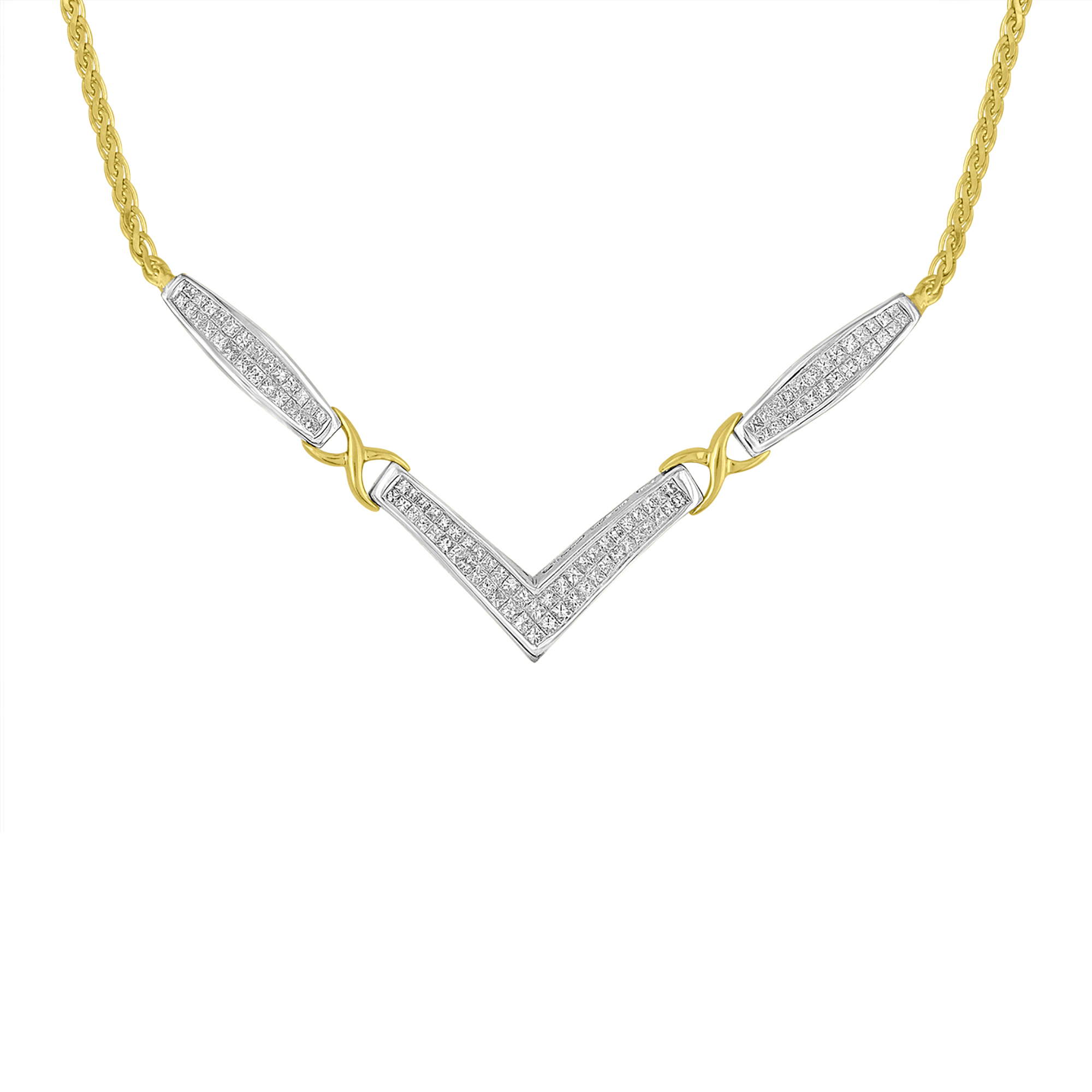 This stunning 14K yellow and white gold pendant necklace features flared rectangle shapes followed by X-shaped links sandwiching a flared V shaped centerpiece. Both the rectangles and the V shaped segments are inset with two rows of invisible set princess cut diamonds set in 14K white gold while the X shaped links are made of 14K yellow gold. The necklace has a wide franco chain with a lobster claw clasp. The contemporary yet classic 18″ necklace complements any neckline beautifully. This authentic design is crafted of real 14 karat gold, a precious metal that will keep a tarnish-free shine for years to come. This sweet necklace makes a great gift for any special occasion! Whether worn for daytime glamour or evening sparkle, this necklace is gorgeously versatile. Coordinate it with your favorite diamond earrings or other diamond jewelry to create a complete and elegant ensemble. It’s a classic and feminine piece she’ll want to show off every day.