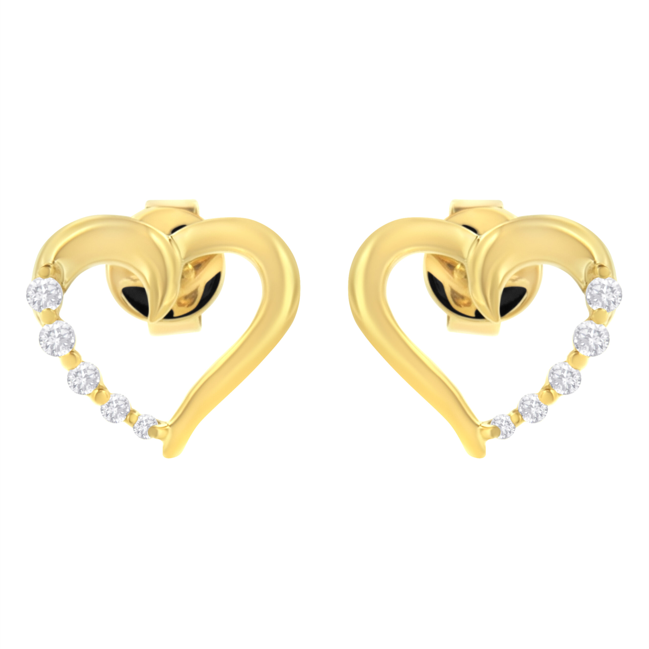 Admire your beloved with the touch of this fascinating Diamond Journey Earrings that will surely captivate her. Stunning pair of heart shaped earrings showcases 10 dazzling round cut diamonds representing your growing love. Diamonds are beautifully prong set in luminous 14 karat yellow gold. Total diamond weighs 1/8 ctw.