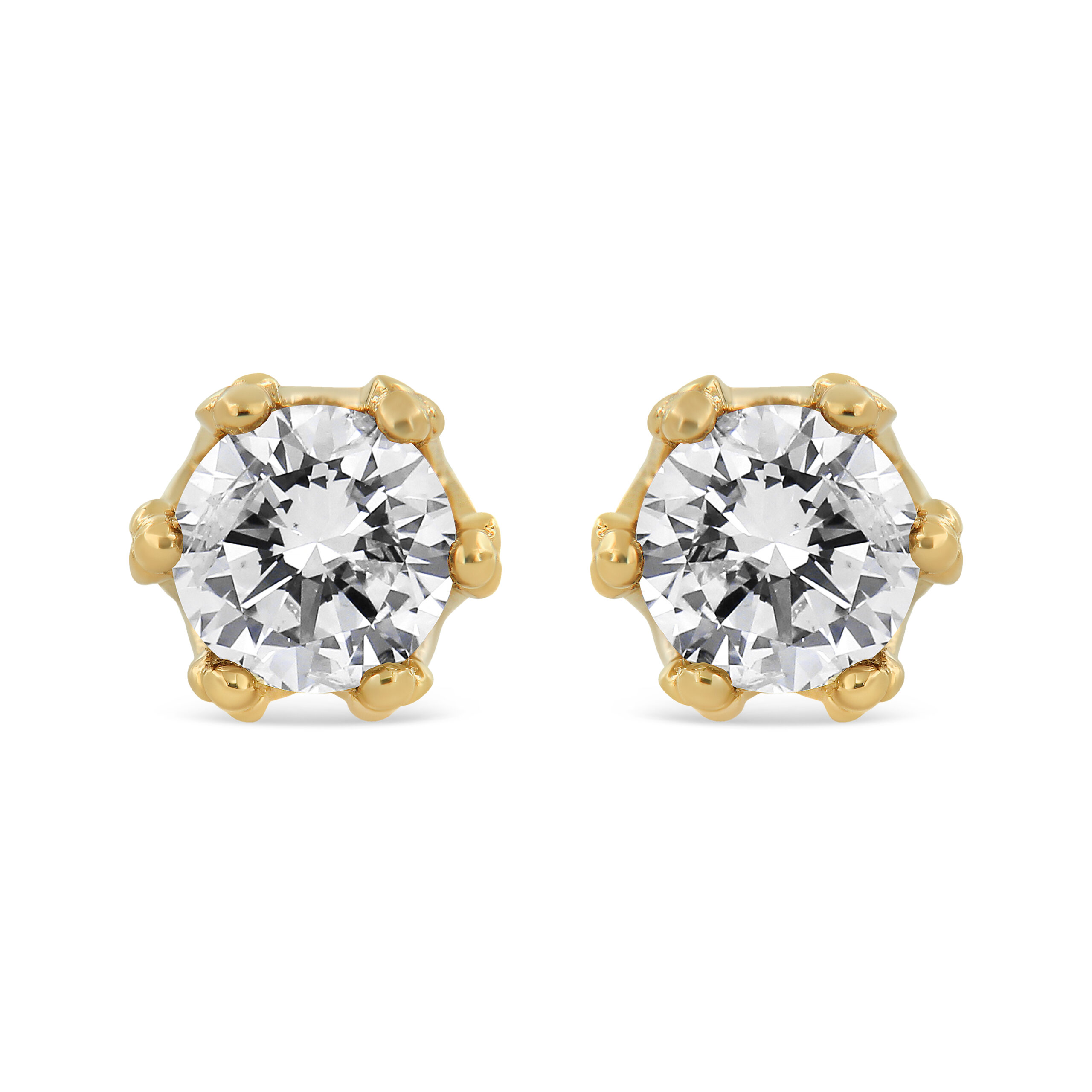 With regal hidden details, these diamond stud earrings are anything but ordinary. From the front, these 14kt yellow gold studs look like solitaires with a multi-prong setting. But the sideview brings into focus the crown design. Round diamond accents stud the base of the crown and the points hold the front-facing round diamond in place. These earrings include 2.0 cttw of natural diamonds and they have posts with screw backs for comfortable secure wear. These elegant gold and diamond crown studs will make the perfect addition to to your jewelry collection.