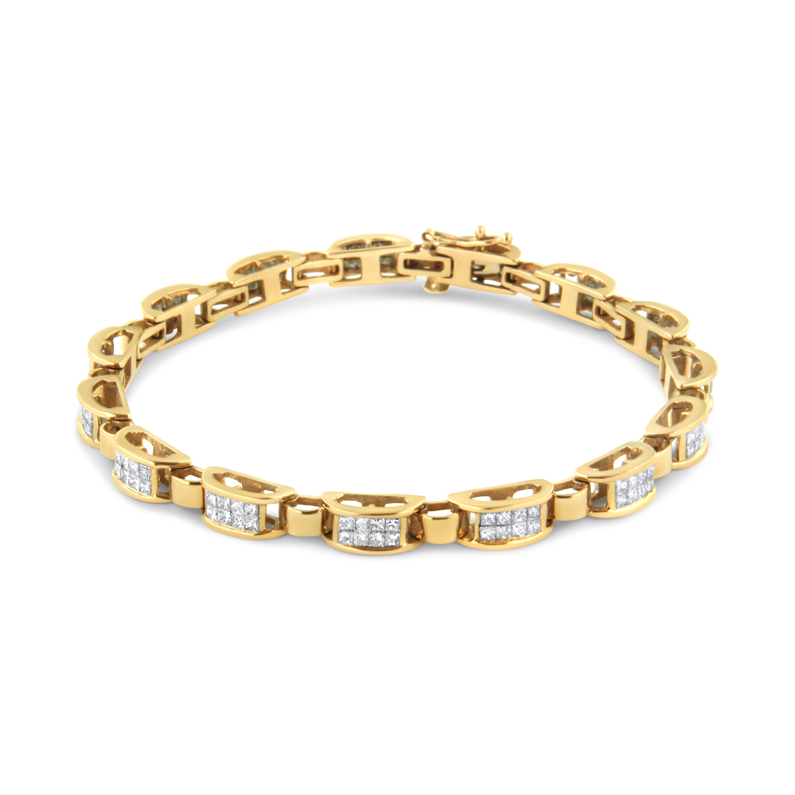 This geometric pattern link bracelet is a timeless piece. Small yellow gold bands link with larger bands inlaid with eight princess cut diamonds. 2 1/2ct TDW in diamonds shine in this design. A box with clasp mechanism keeps this 14k yellow gold bracelet design secure. The diamonds sparkle in an invisible setting and will shine bright on your wrist. You will love how this bracelet pairs well with any outfit you put on.