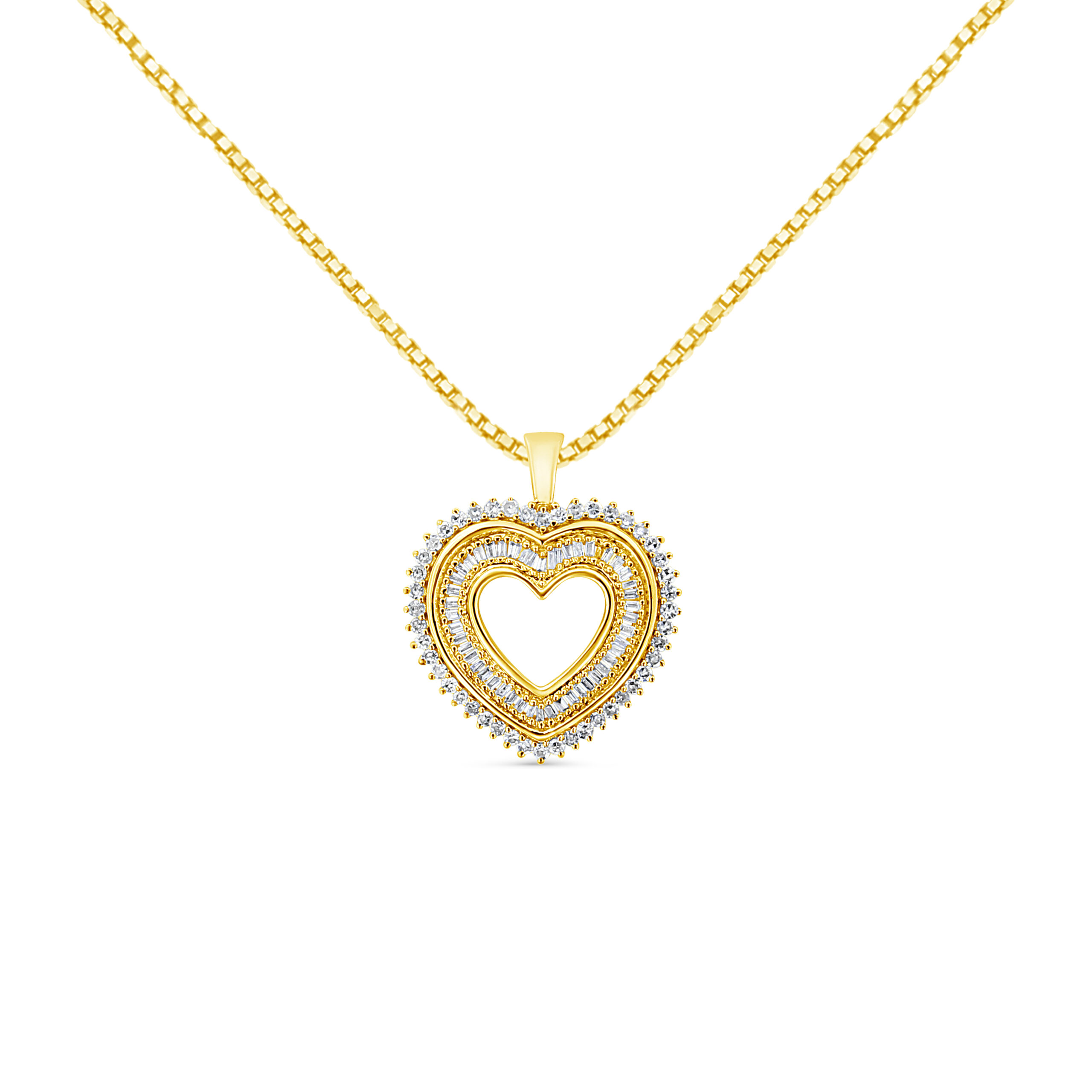 Feminine and sophisticated, this beautiful silver cluster heart necklace is the perfect gift for you or for the special lady in your life. This stunning pendant is crafted from genuine .925 sterling silver plated in 14k yellow gold, a metal that will be tarnish-free for years to come. This 1 c.t. necklace is embellished with natural round and baguette-cut diamonds in an alluring, composite design. This piece comes with an 18″ inch gold plated silver box chain for a safe and secure fit on your neckline.