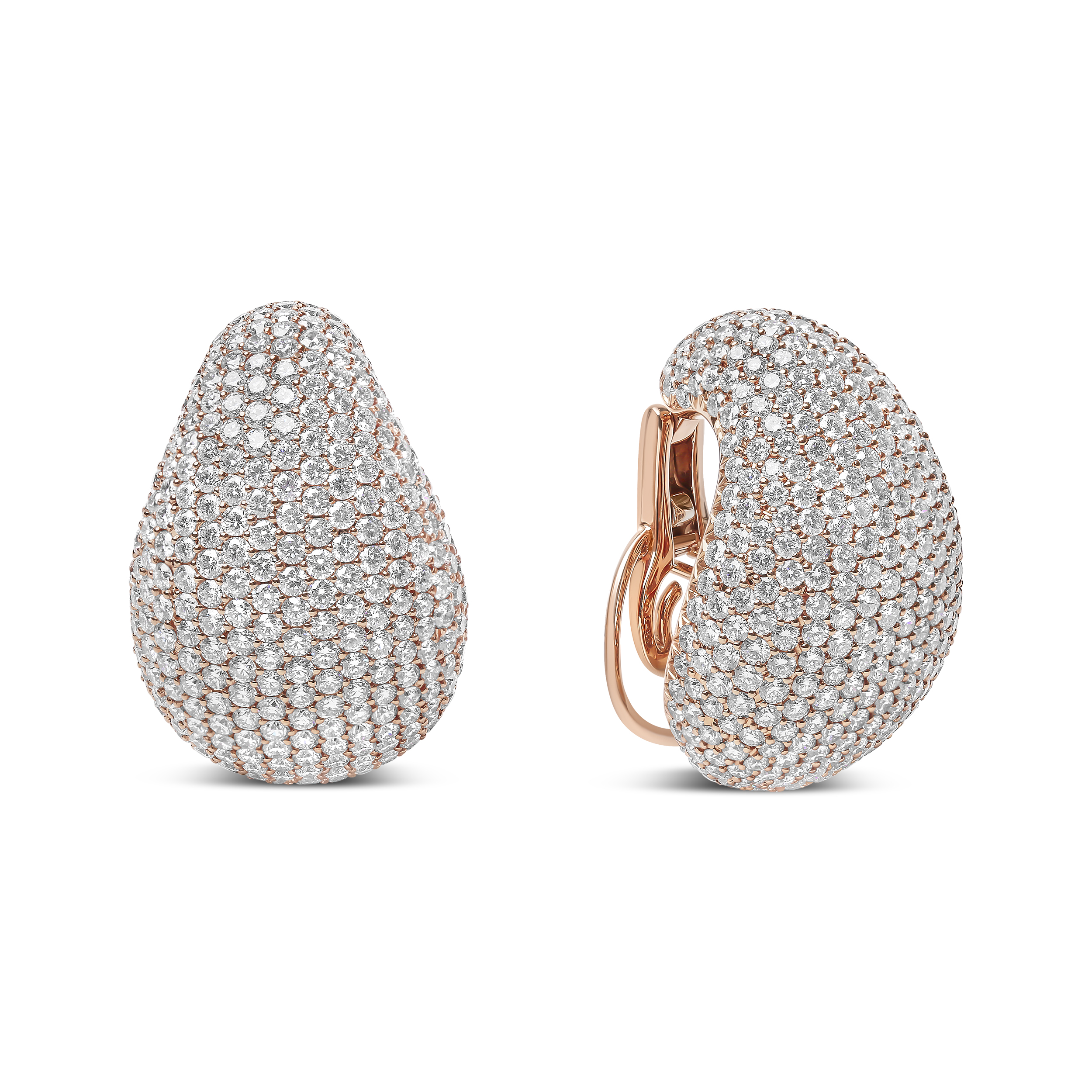 Drenched in the brilliant sparkle of over 675 total diamonds, these sculptural stud earrings display their dazzling wealth in pave settings in an all-over design of ultimate glamour. Crafted of genuine 18k rose gold, these domed earrings exude luxury and romantic beauty. Round diamonds twinkle from every angle, making you the toast of any room you enter. These magnificent diamonds total 13 1/5 cttw with an approximate G-H Color and SI1-SI2 Clarity. Omega findings secure these pierced earrings in your ears for comfortable, worry-free wear.