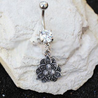 316L Stainless Steel Jeweled Vintage Lotus Dangle Navel Ring