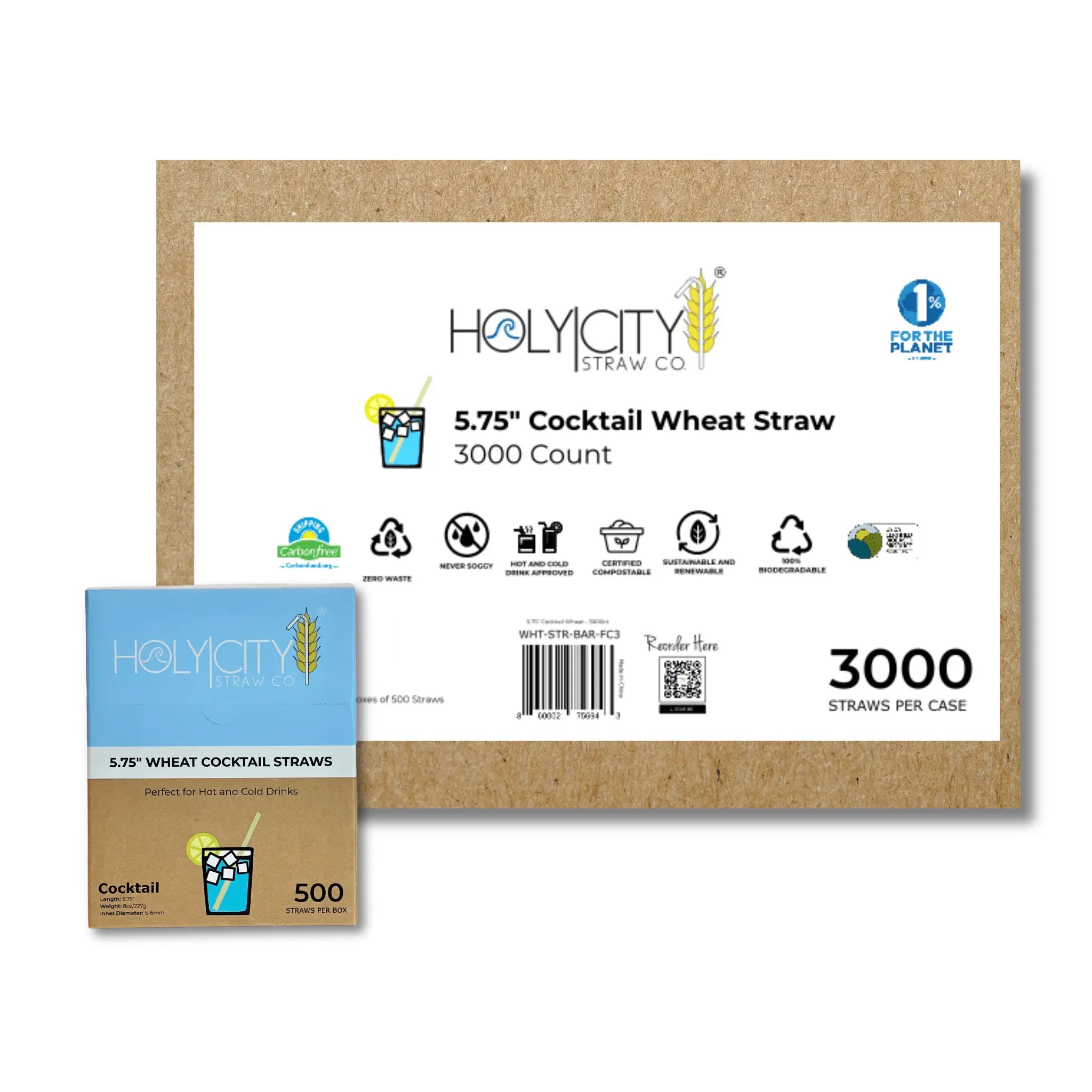HolyCityStrawCompany 5.75-inch Wheat Cocktail Straws box of 500 straws displayed with a glass of straws next to the packaging