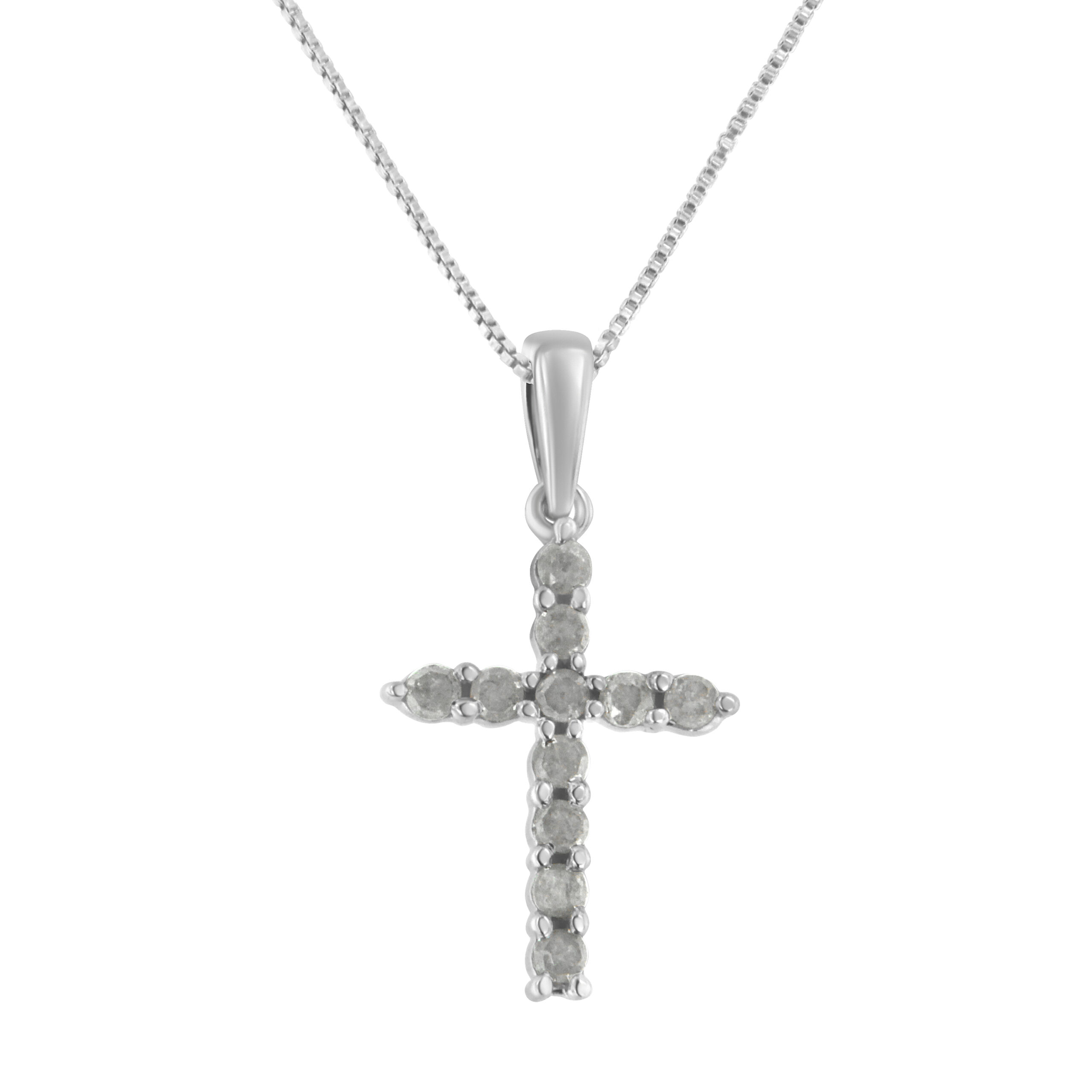 Fashioned in sterling silver, this traditional cross pendant is studded with eleven 1/3ct tdw of shimmering rose cut, promo quality diamonds. The pendant suspends along a box chain that secures with a spring ring clasp. Promo quality diamonds are on the lowest of diamond color and quality scale. Round-cut, promo quality diamonds are milky and cloudy in nature. They have asymmetrical ball shape and are filled with inclusions.