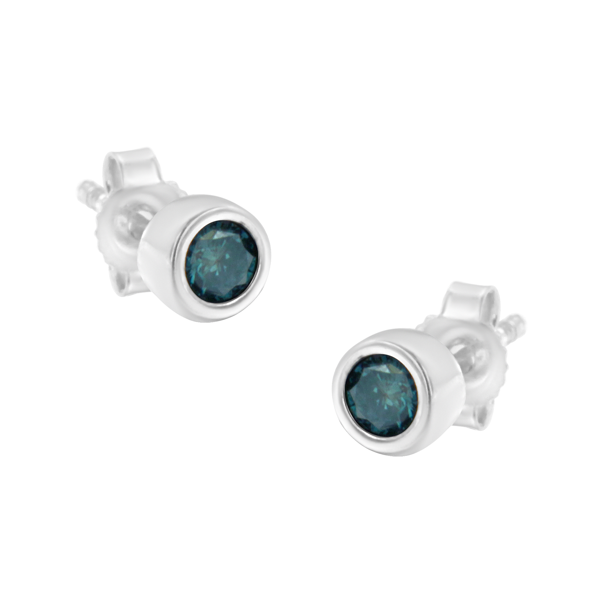 .925 Sterling Silver 1/5 Cttw Round Brilliant-Cut Blue Diamond Bezel-Set Stud Earrings (Fancy Color-Enhanced, I2-I3 Clarity)
