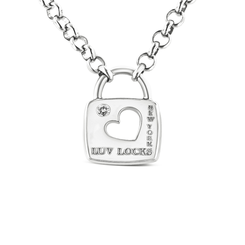This alluring pendant necklace takes on a contemporary twist with a captivating lock silhouette made from .925 sterling silver. Marked “Luv Locks” in a bold engraved script, this lock pendant features a heart cutout at the center with a diamond accent in a bezel setting, which provides a secure resting place for the stone to sparkle. This diamond is of an approximate I2-I3 clarity and H-I color. The edgy cable chain is a modern look in an 18″ length with spring ring clasp for secure wearing.