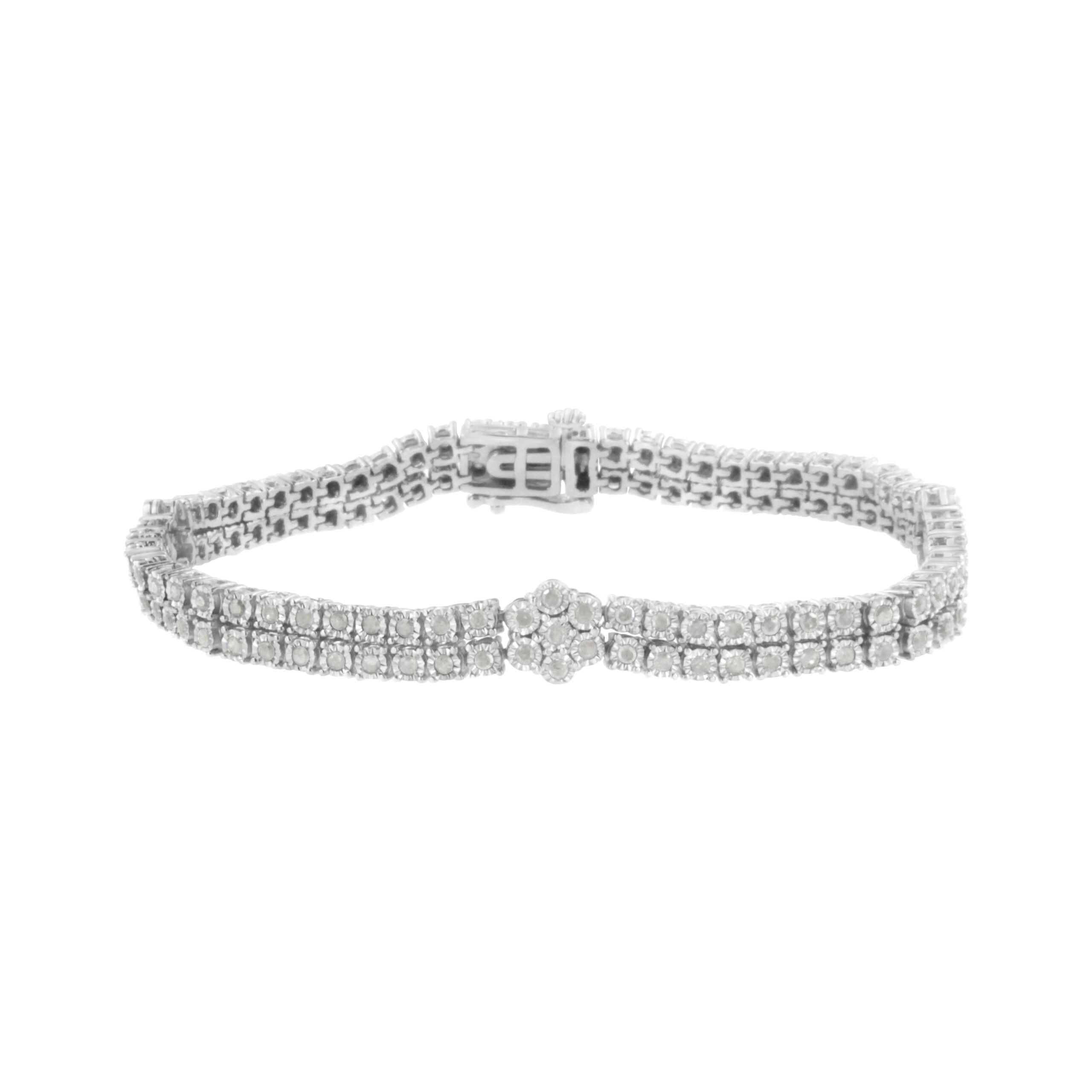 This elegant sterling silver bracelet features 2ct TDW of glittering diamonds. A central round cut diamond flower cluster sits as the centerpiece of this design. Two rows of miracle set round diamonds complete the bracelet. This piece fastens securely with a box clasp.