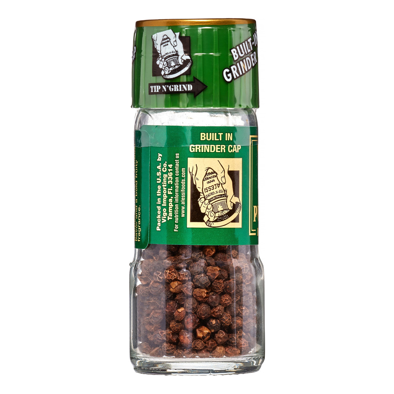 Alessi Black Peppercorns are packed in our unique, easy-to-use, Tip n Grind glass bottles. Cleverly designed with a grinder built in, simply invert bottle and twist cap in the direction of the arrow. Freshly ground spices retain more of the precious oils lost in pre-ground forms. Enjoy top quality, sun dried, freshly ground peppercorns and savor the robust flavor and bold, fruity fragrance anytime. Perfect for your home, R.V. or picnic table. Its uses are limitless.
