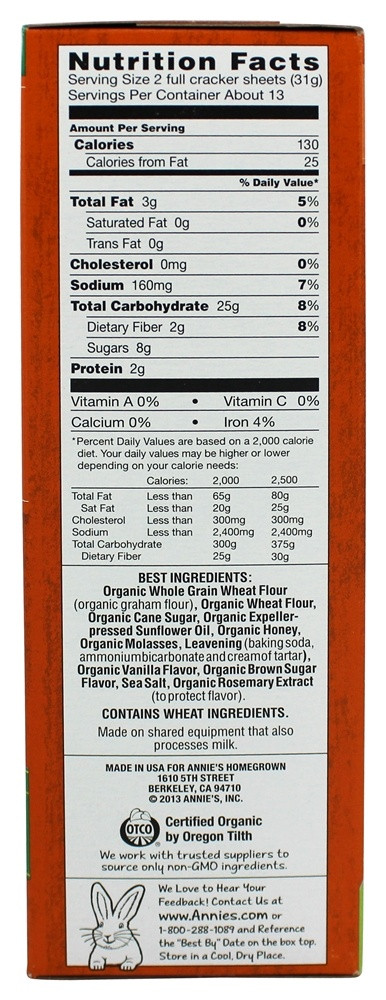 Finally, a tasty certified organic Honey Graham Cracker that your whole family will love! Perfect plain, topped with peanut butter, or in your favorite baking recipes.