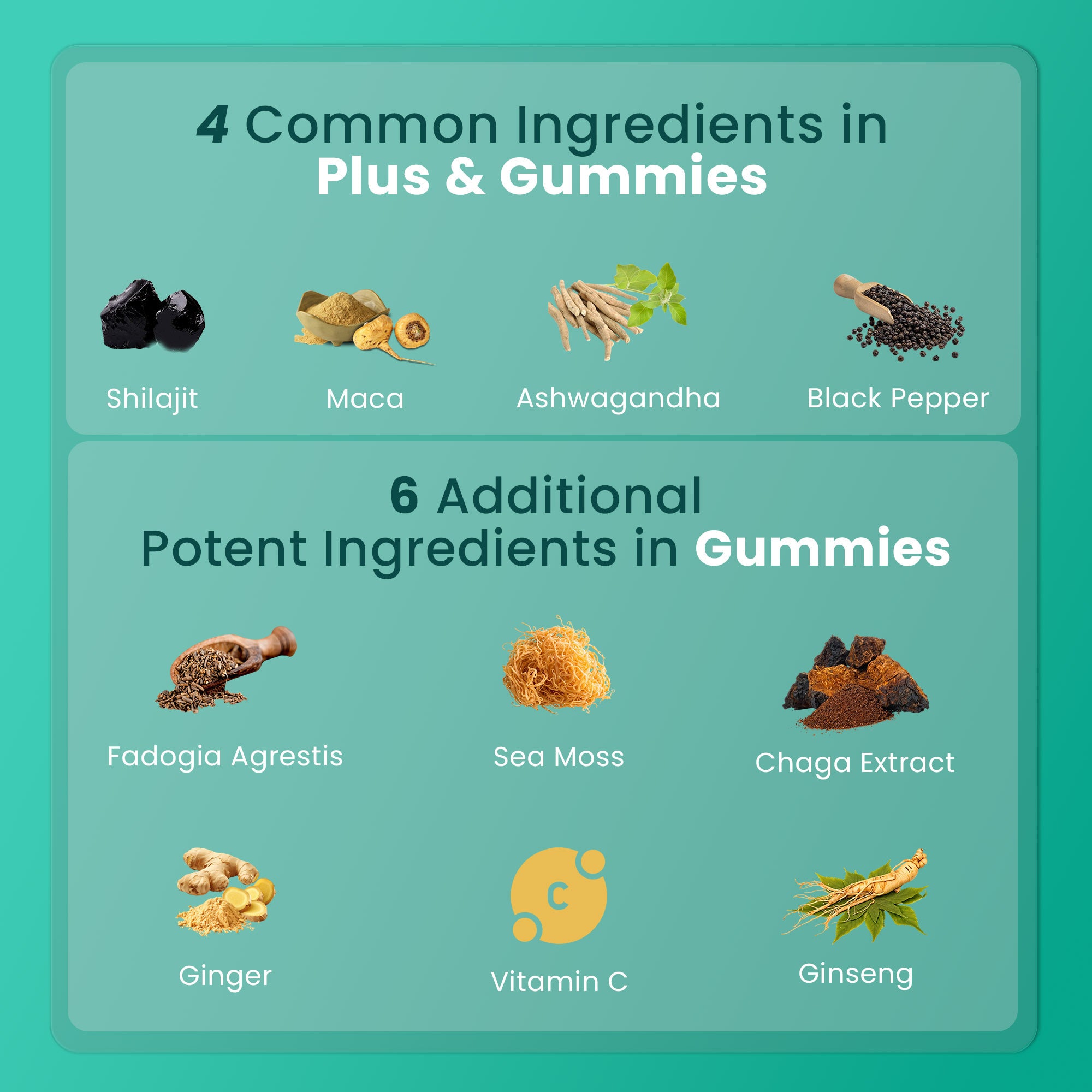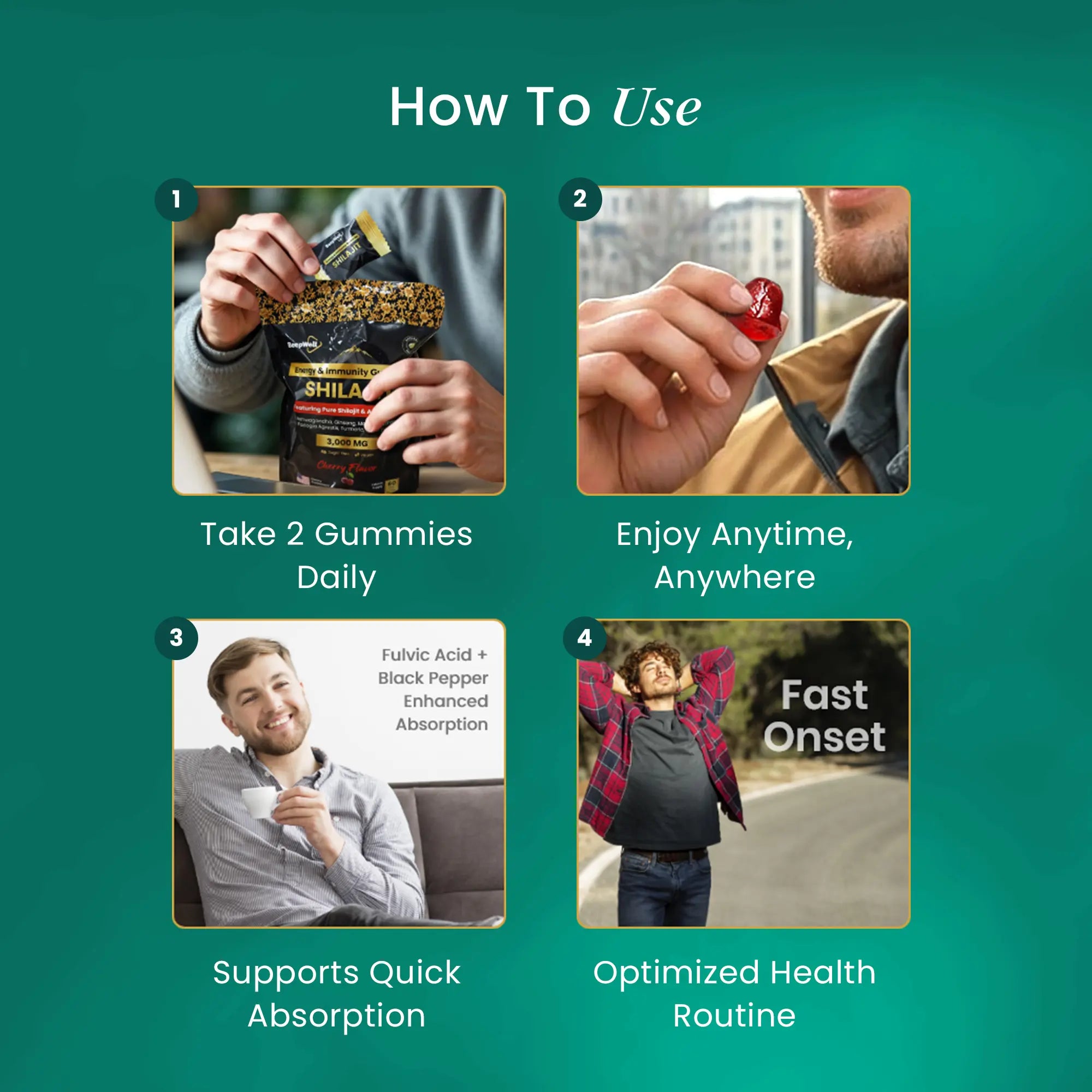 Includes 60 Count, gluten-free gummies. Each gummy contains Shilajit , Ashwagandha, Black Musli, and Gokshura. No added sugar or artificial colors.
