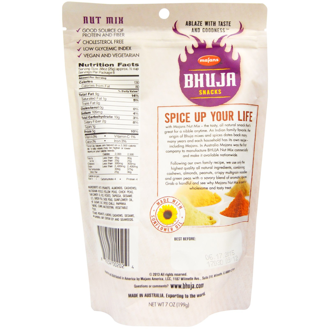 Enjoy Bhuja Nut Mix. Blend Of Cashews, Almonds And Peanuts. Made With Sunflower Oil. Contains Crispy Multigrain Noodles And Green Peas. Trans Fat Free; Gluten Free; All-Natural. (Note: Description is informational only. Please refer to ingredients label on product prior to use and address any health questions to your Health Professional prior to use.