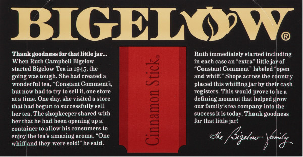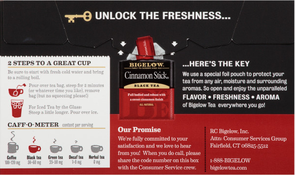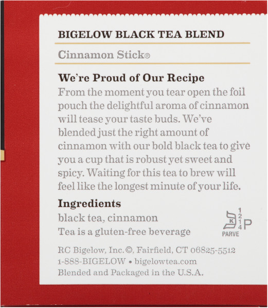 Enjoy Bigelow Cinnamon Stick Tea. Cinnamon Stick??? Tea In Cinnamon Stick???, We Use Only The Finest Mountain-Grown Tea Blended With Pure, Natural Cinnamon. 20 Individually Foil Wrapped Tea Bags Per Box. 6 Boxes Per Case. Net Wt. 1.28 Oz. (36G). Ingredients Black Tea, Cinnamon Caffeine Status 30-60Mg Gluten Gluten Free. (Note: Description is informational only. Please refer to ingredients label on product prior to use and address any health questions to your Health Professional prior to use.