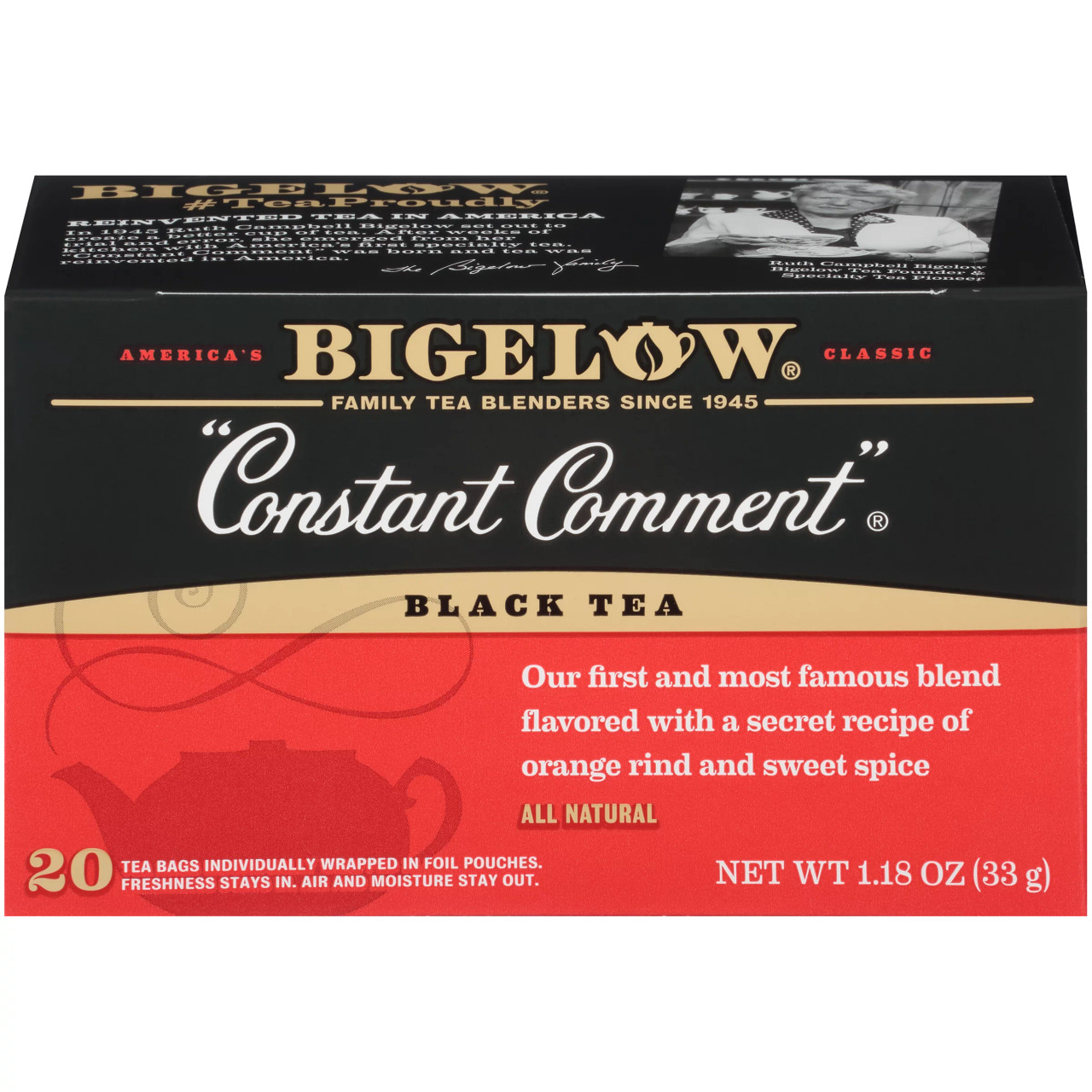 Enjoy Bigelow Constant Comment Tea. Take Your Favorite Tea Wherever You Go! Bigelow’s Individual Flavor-Protecting Envelopes Ensure Great Taste And Freshness. Individual Fresh Pack. Indulge In The Soothing Ritual Of Tea. Sipped Throughout The Day, Tea Quenches, Soothes, Satisfies, And Delivers Healthful Antioxidants. From The Wonderful Aroma That Fills The Air The Moment It Starts Steeping, You’Ll Know That Bigelow Tea Is Like No Other. To Create Our Flagship Brand Constant Comment, We Blend Tender, Hand-Picked Tea Leaves With The Rind Of Oranges And Sweet Spice, Then Individually Wrap Our Tea Bags In Flavor-Protecting Pouches To Seal In Its Goodness. Remember, Adding A Cup Of Bigelow Tea Throughout Your Busy Day Can Contribute To Your Overall Well Being. So Sit Back, Relax And Make Tea Time Your Time To Refresh Mind, Body And Spirit! And For Those Who Share A Passion For Good Taste. Blended And Packaged In The U.S.A. (Note: Description is informational only. Please refer to ingredients label on product prior to use and address any health questions to your Health Professional prior to use.