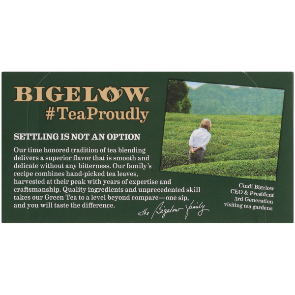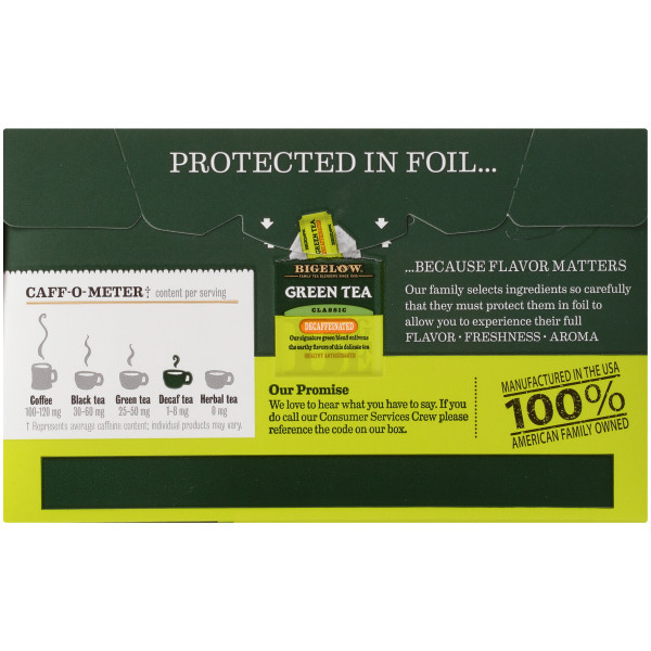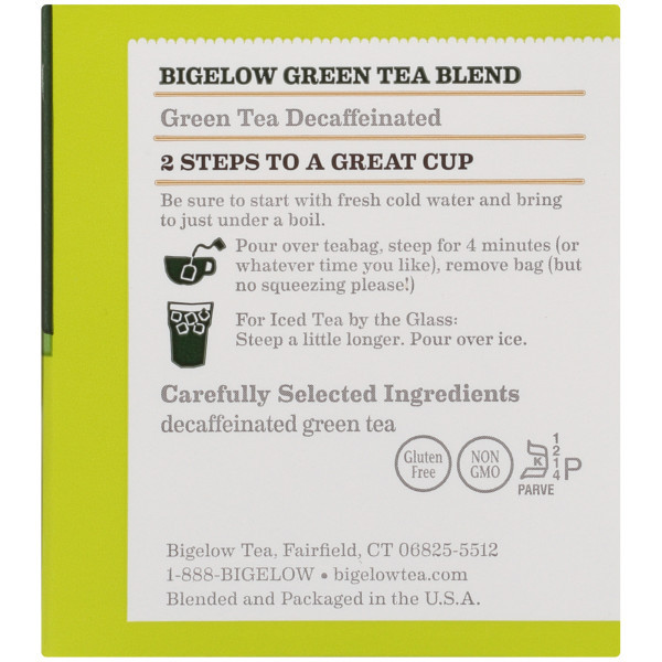 Enjoy Bigelow Decaffeinated Green Tea (6×20 Bag). Decaffeinated Green Tea offers the same delicious flavor of regular Green Tea in a naturally decaffeinated form. Our natural decaffeination process removes 99.6% of the caffeine without sacrificing flavor or the benefits of green tea. 20 individually foil wrapped tea bags per box. 6 boxes per case. (Note: description is informational only. Please read product label prior to use and consult your health professional with any question prior to use.