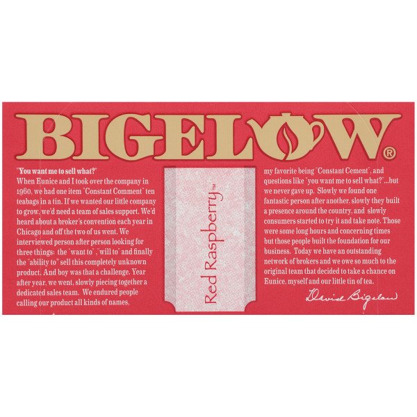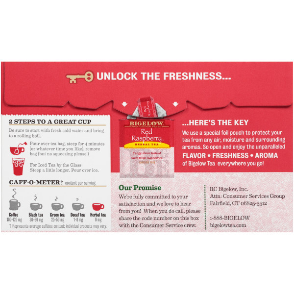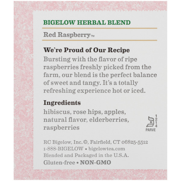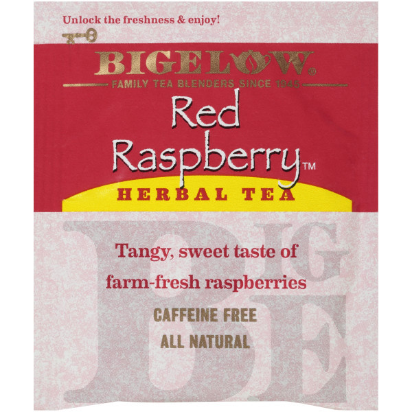 Enjoy Bigelow Red Raspberry Herbal Tea. Individual Fresh Pack. Natural And Artificially Flavored. A Country-Fresh Blend With The Taste Of Ripe Raspberry. No Caffeine. Individual Fresh-Pack Locks In Flavor. For Three Generations The Bigelow Family Has Specialized In Creating A Variety Of Deliciously Different Teas And Herb Teas. Our Individually Overwrapped Tea Bags Ensure That The Last Cup Of Tea You Have From This Box Is Just As Delicious As The First. Each Tea Bag Is Individually Sealed In A Foil Packet. Blended And Packaged In The U.S.A. (Note: Description is informational only. Please refer to ingredients label on product prior to use and address any health questions to your Health Professional prior to use.