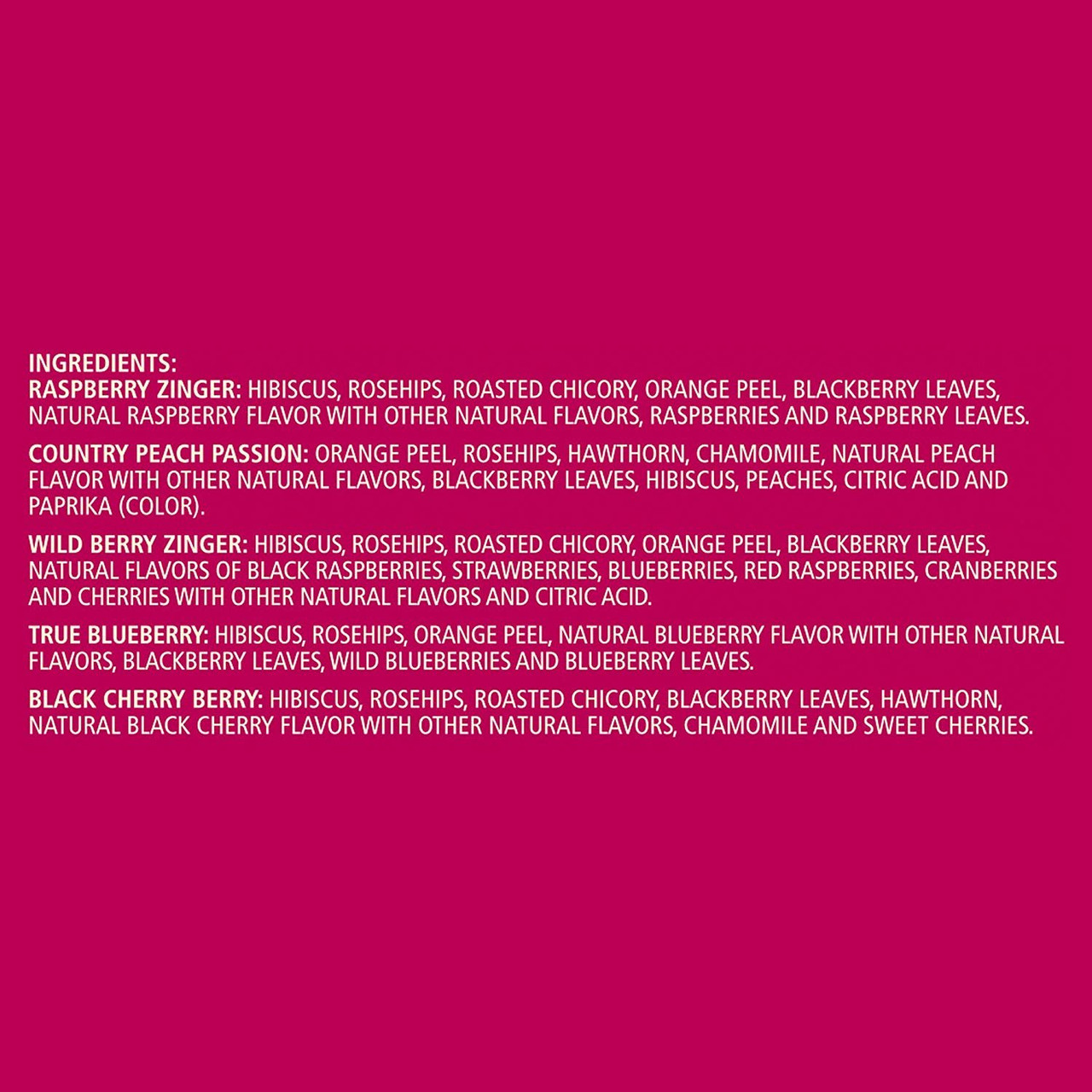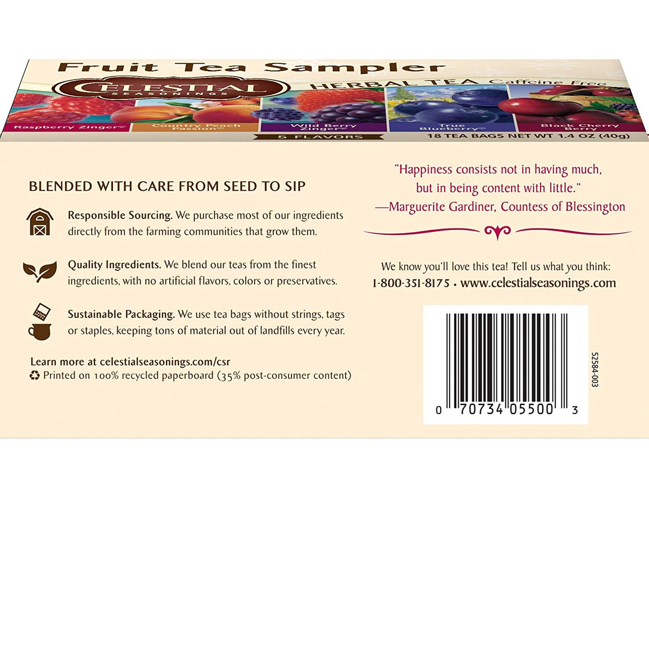 Enjoy Celestial Seasonings Fruit Tea Sampler . Our Fruit Tea Sampler Includes Tea Time Favorites: Raspberry Zinger, Country Peach Passion And Others. Bursting With Fruit Flavor; Satisfying Hot, Invigorating Over Ice; 100% Natural & Caffeine Free. (Note: Description is informational only. Please refer to ingredients label on product prior to use and address any health questions to your Health Professional prior to use.