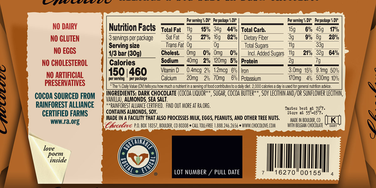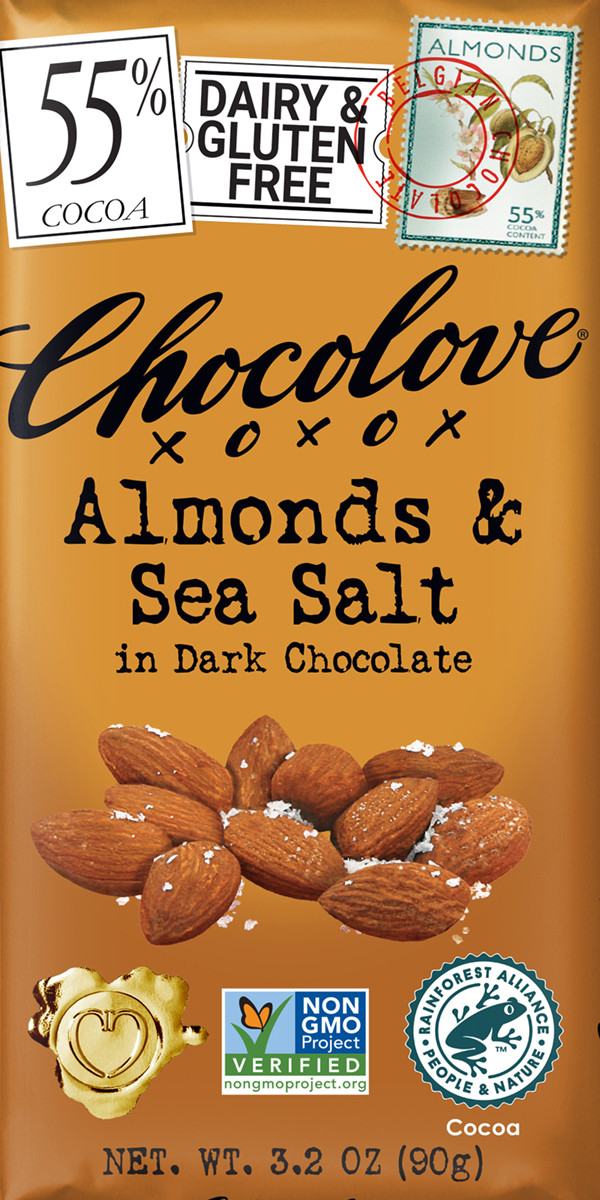 Enjoy Chocolove Almonds & Sea Salt In Dark Chocolate . Dark Semisweet Chocolate, Whole Dry Roasted Almonds And Sea Salt. At First Bite, Crunchy Almonds Release Their Flavor In A Swirl With Chocolate. The Sea Salt Crystals Continually Reset Your Sweet Taste Buds And Make A Tantalizing Taste Combination That Keeps You Wanting More. (Note: Description is informational only. Please refer to ingredients label on product prior to use and address any health questions to your Health Professional prior to use.
