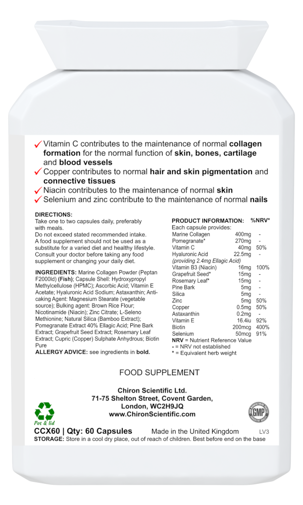 Marine collagen is the primary ingredient in this supplement and is obtained from marine sources – widely regarded as the highest quality, and most bioavailable source of collagen. This is then complemented by the inclusion of hand-picked vitamin, mineral, herbal and other nutrient allies.