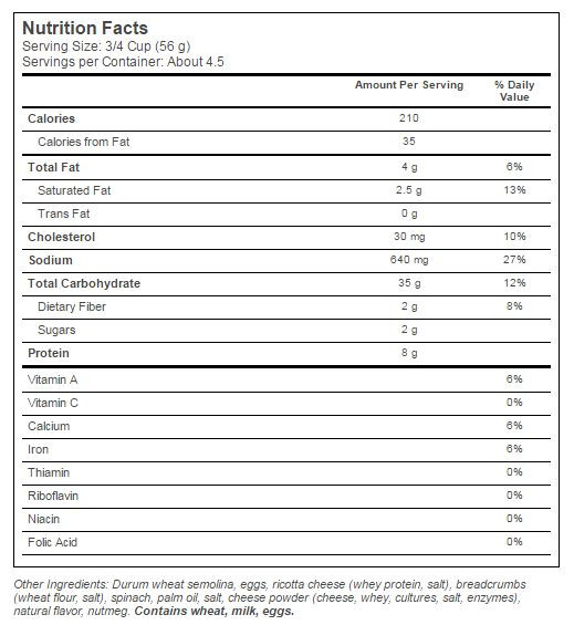 Our authentic Italian recipe begins with delicate egg pasta made from only the finest quality durum wheat semolina. We carefully fold our pasta around a savory blend of creamy ricotta, spinach and a dash of nutmeg, then pinch them into small rings to form one of Italy??s most beloved pasta shapes. While tortellini are traditionally served in broth-based soups, get creative and liven up your cold pasta salad recipes, pair with a fresh tomato sauce or simply saut?? with extra virgin olive oil, fresh herbs and a sprinkle of grated Parmigiano-Reggiano.