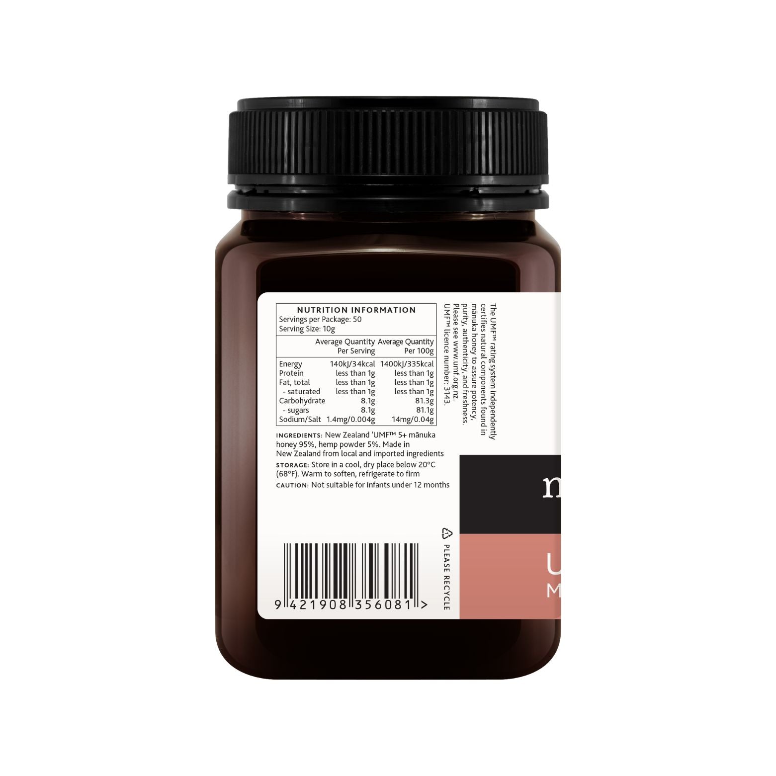 This honey is made of 95% UMF 5+ Manuka (MGO 100+) honey and hemp protein. Hemp Protein is made from grinding Hemp seeds into a fine powder. Hemp protein has a complete amino acid profile., containing all nine essential amino acids and branched chain amino acids that the body cannot produce. Distinctive nutty flavour.