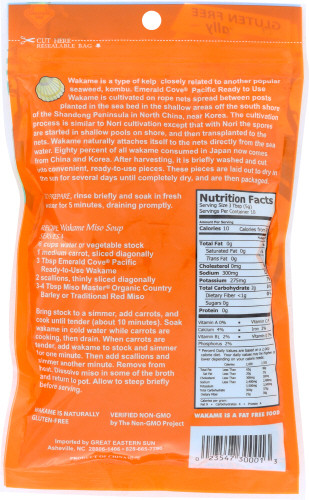 Familiar To Sushi Enthusiasts From Its Use In Miso Soup, Wakame Is Also Used In Seaweed Salads. Emerald Cove Wakame Is Ready-To-Eat And Can Be Tossed Right Out Of The Bag Into Miso Soup! Because Of Its Superior Alkalinity, Wakame Is Extremely Beneficial For Health And Vitality.: Gluten Free