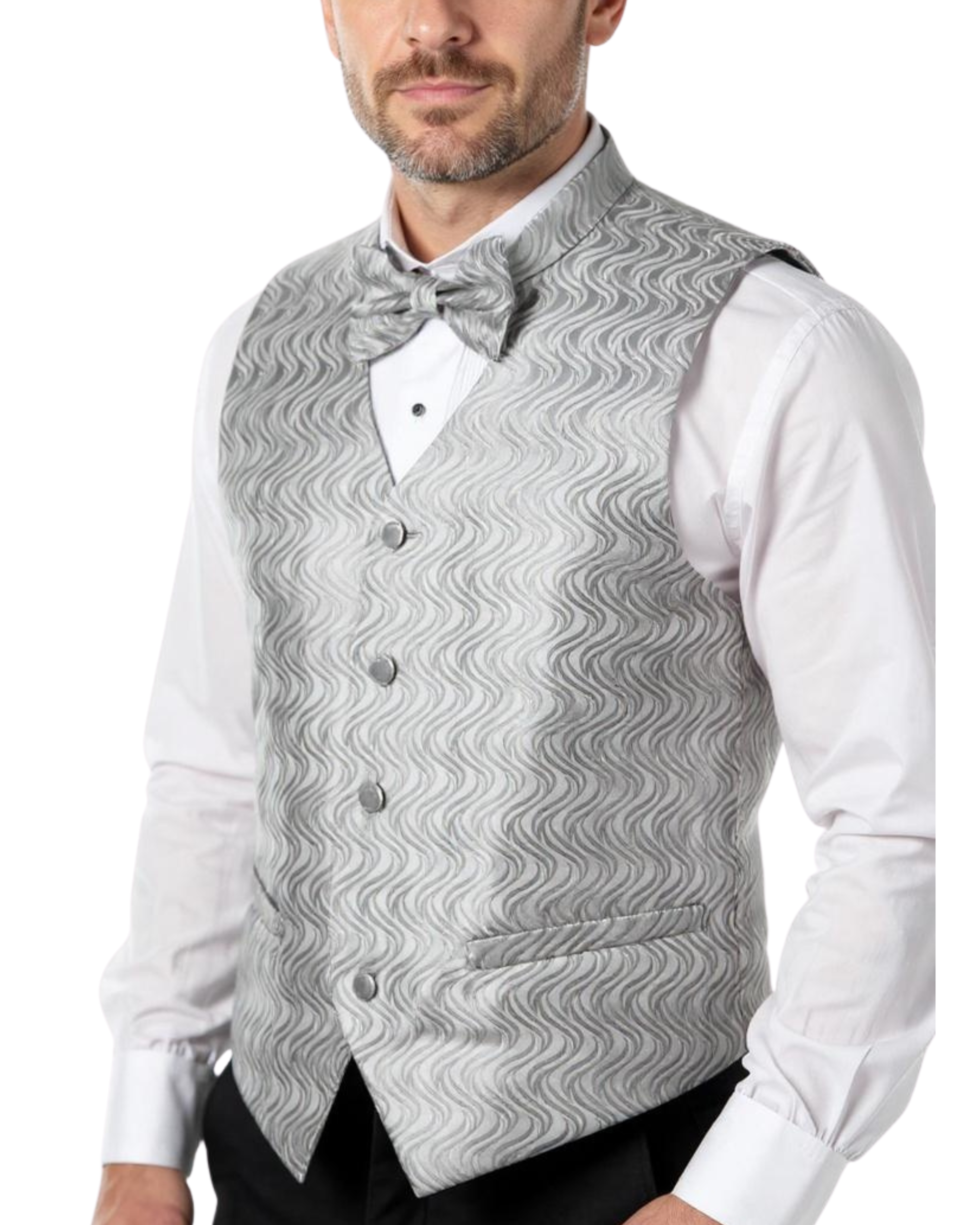 This distinguished and elegant formal vest set features a 100% Satin Microfiber body.  Includes vest, necktie, bowtie and pocket-square. This timeless quality set is sure to keep you looking smashing and turning heads at your next formal attire engagement.