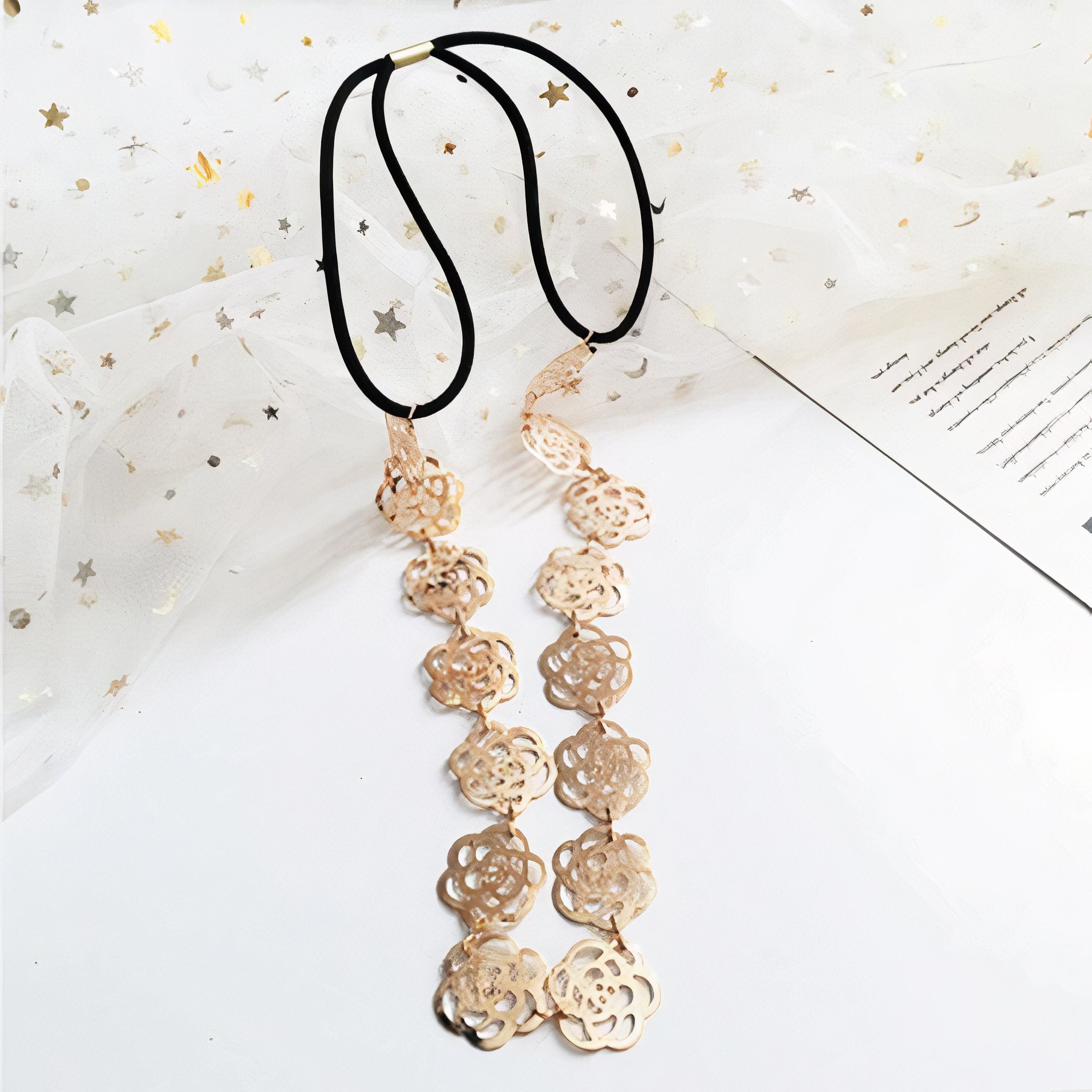 Beautiful headband made of metallic, flat flower beads and elastic.