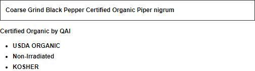 Piper NigrumNon-IrradiatedKosherPepper lends satisfying heat and bite to most any dish (and it’s great for salt-free diets). It works well in combination with other herbs and spices, too, and is commonly found in spice blends.One of the world’s most popular spices, black peppercorns are actually unripe green fruits (berries) that have been sun-dried after fermenting. Black, white and green peppers all come from the woody tropical plant Piper nigrum.Pepper berries are at first green; they turn red as they ripen. The stage at which they’re harvested (and whether or not they are husked) determines the color of the resulting spice. Black pepper is harvested while the berries are still green–before ripening. Sun drying turns them dark brown and wrinkly. White pepper results when the berries are picked fully ripe and then husked and dried. Green peppercorns are picked before ripening and preserved before drying. Pepper’s rich history can be traced through the records of ancient Rome, the monastic records of the Middle Ages, and the logs of early traders and explorers. In 1180, A Guild of Pepperers–the most important guild of the time–was in existence in London. Often equated with money, pepper has been used for taxes, rent, dowries and ransom. When Alaric the Goth besieged Rome, gold, silver, and pepper were demanded as ransom. (The gold and silver were easy enough to come by, but the pepper gave them some trouble.) The quest of pepper largely defines the history of the spice trade.