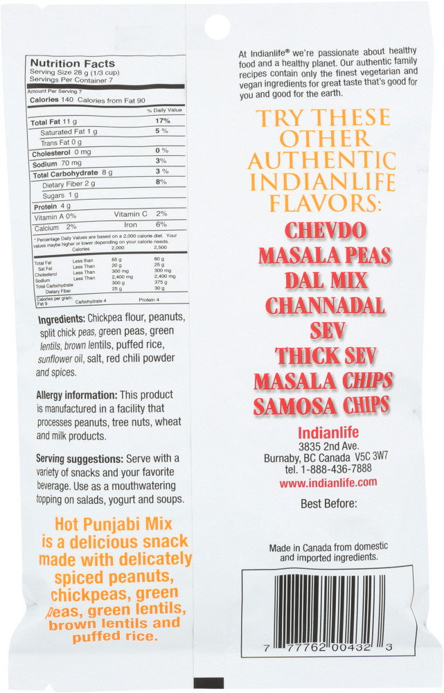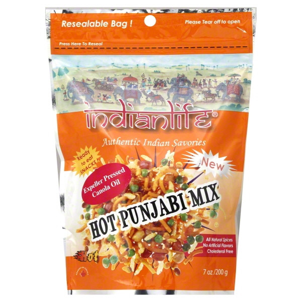 Enjoy Indianlife Hot Punjabi Mix. One Of Our Most Popular Snack Mix Product Made With Chick Pea Crisps, Legumes, Cashews, Peanuts And Other Things Is Hot And Tastes Fantastic. (Note: Description is informational only. Please refer to ingredients label on product prior to use and address any health questions to your Health Professional prior to use.